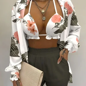 Ensemble chemise et short à imprimé plantes 3 pièces avec haut court