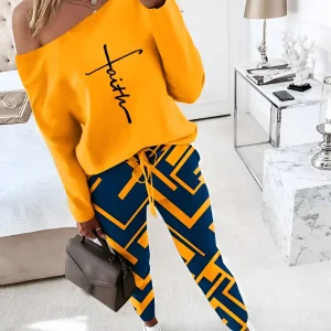 Ensemble haut à col asymétrique et pantalon à cordon de serrage à imprimé géométrique