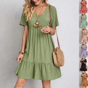 Élise – Robe d’été col V à manches courtes, mode estivale décontractée, coupe ample et volantée