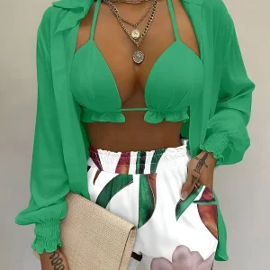 Ensemble de bikini 3 pièces à cordon de serrage imprimé sur l’ensemble avec cache-maillot