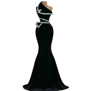 Robe de soirée sirène asymétrique en velours noir et argenté