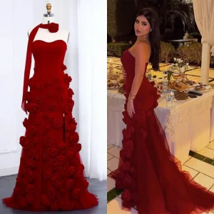 Robe de soirée exquise sans bretelles, sans manches, fente latérale, fleurs, traîne