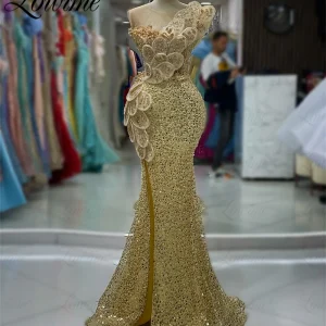 Lowime Robe de soirée en cristaux Aso Ebi sirène à perles dorées et champagne