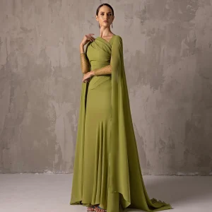 SHANIA Robe de soirée asymétrique en mousseline de soie vert sauge avec manches cape