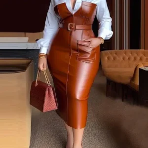Gymystars Femmes Robes Chemise Jupe PU Boutons Manches Longues Patchwork Poche Skinny Ceinture Revers