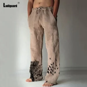 Pantalon de plage décontracté en lin avec poches pour homme, grande taille, imprimé arbre et oiseaux, à cordon de serrage