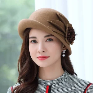 Chapeau cloche vintage d’hiver en feutre 100 % laine pour femme avec bord rabattu et fleur