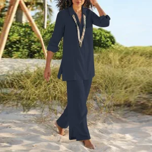 Ensemble d’été sexy à col en V pour femme, style national rétro, manches longues, pantalon décontracté, ample, en coton et lin