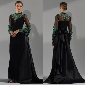 Robe de soirée noire modeste, manches longues, perles appliquées