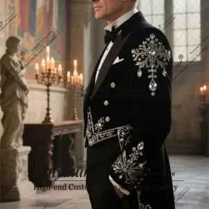 Costume de luxe noir pour homme, 2 pièces, blazer et pantalon, avec appliques florales en cristal