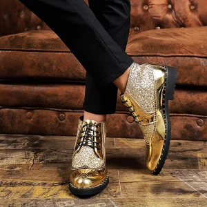 Bottes à lacets à bout pointu, couleur dorée, design tendance, cuir verni, pour hommes