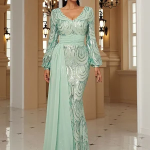Missord Robe de soirée à paillettes vertes pour femmes élégantes à manches longues col en V