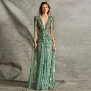 Sharon Said – Robe de soirée de luxe de Dubaï, vert sauge, avec cape, fuchsia, cristal, or
