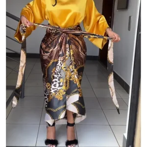 Ensemble 2 pièces haut à col rond et manches cloches + jupe pour femme, élégant, imprimé floral, à lacets
