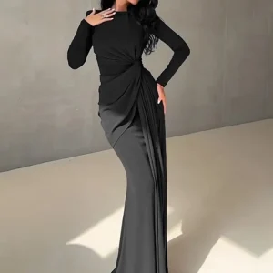 ARIELLE Robe de soirée élégante noire moulante à col rond et manches longues, taille haute