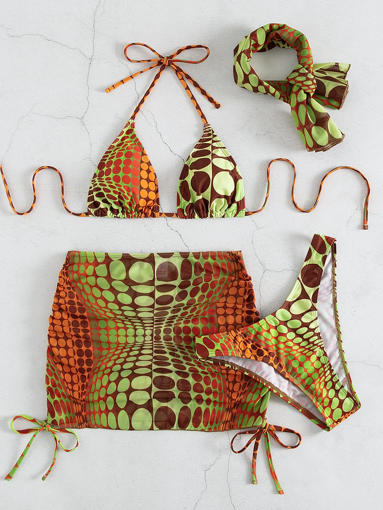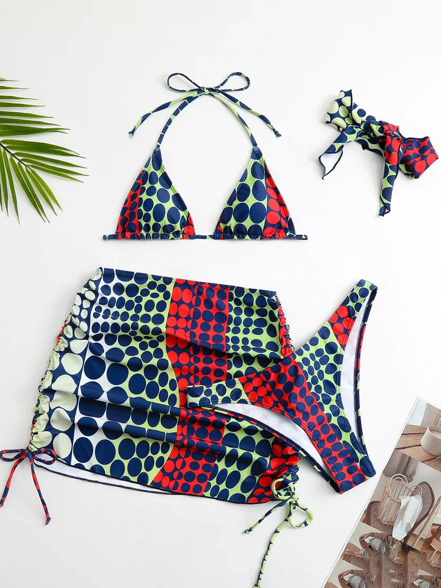 4 pièces imprimé point aléatoire cravate côté licou Bikinis maillot de bain et jupe de plage Sexy