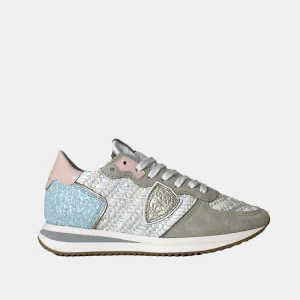 - Baskets en velours noir, mesh blanc et cuir métallisé argent