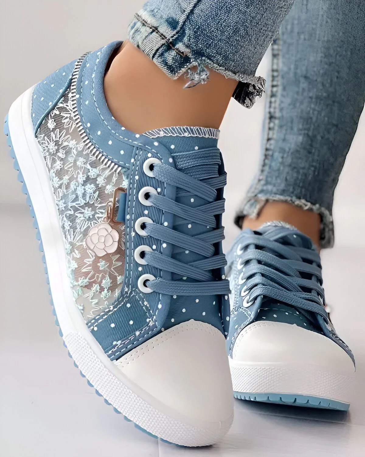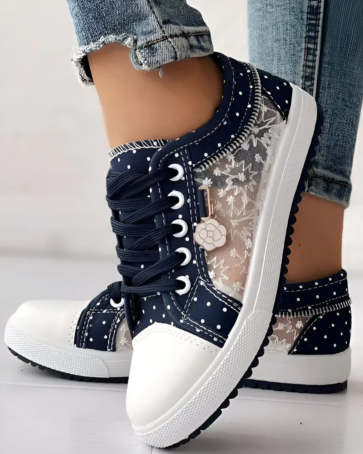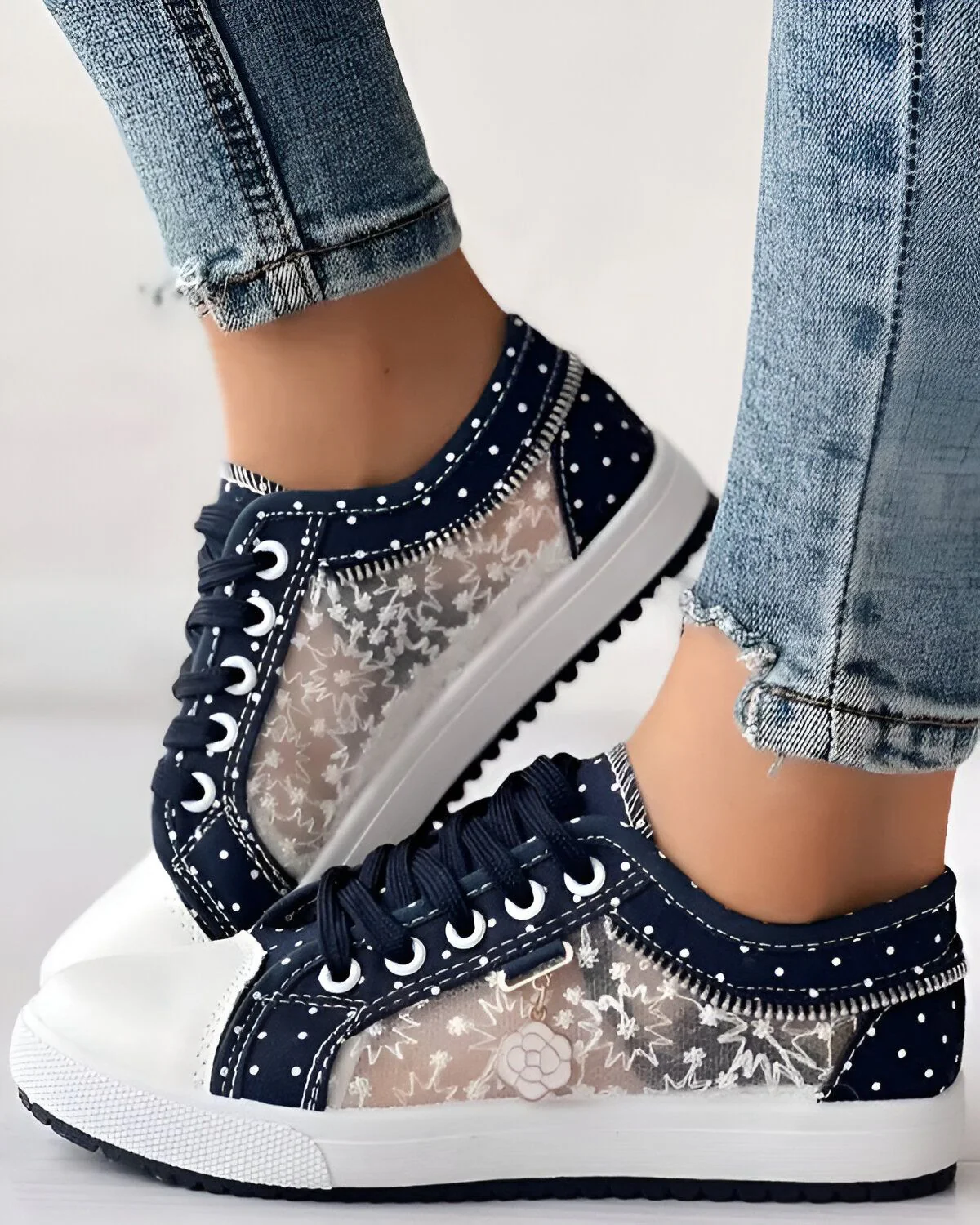 En commandant ces baskets, vous recevrez une paire de chaussures qui vous procurera confiance et style à chaque pas. Chaque colis comprend une paire de baskets à motif floral brodé à pois, prêtes à être portées dès réception. Offrez-vous sans plus attendre ce mélange parfait de style, de confort et de durabilité !