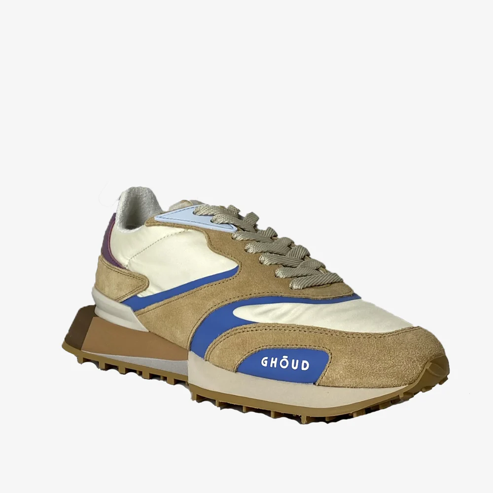 Colorées et tendances, craquez pour les sneakers modèle R2LW en velours et nylon beige/bleu de chez Ghoud. Découvrez toute la collection de chaussures Ghoud sur Ann Tuil.