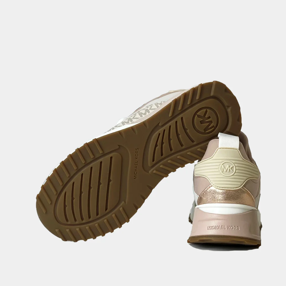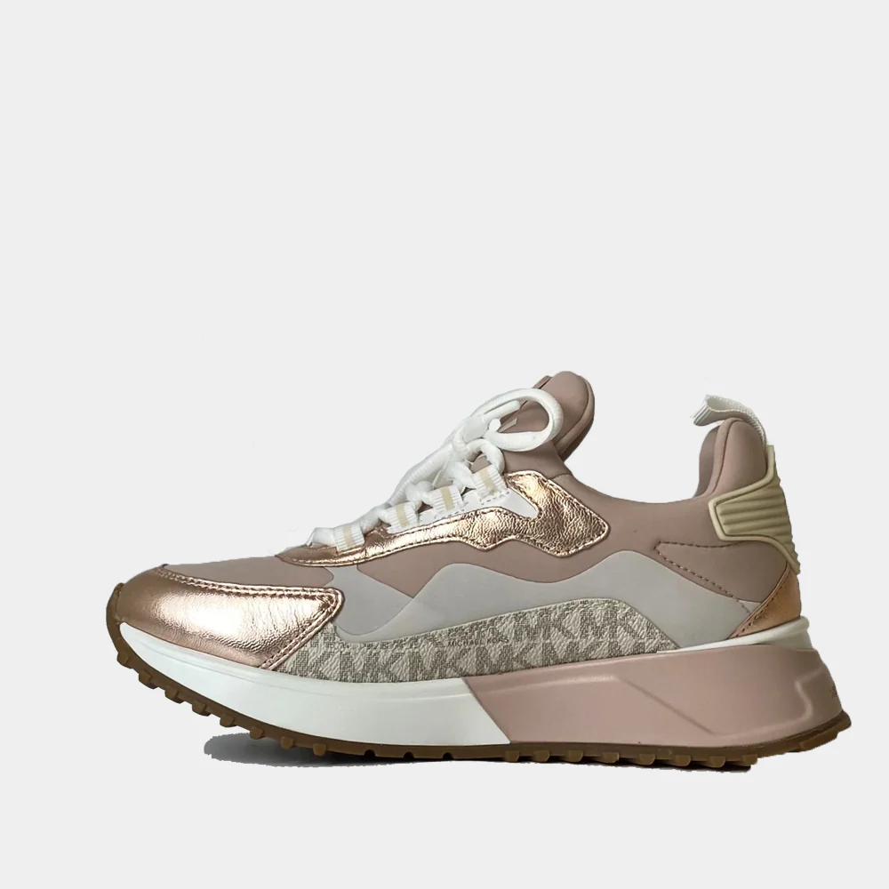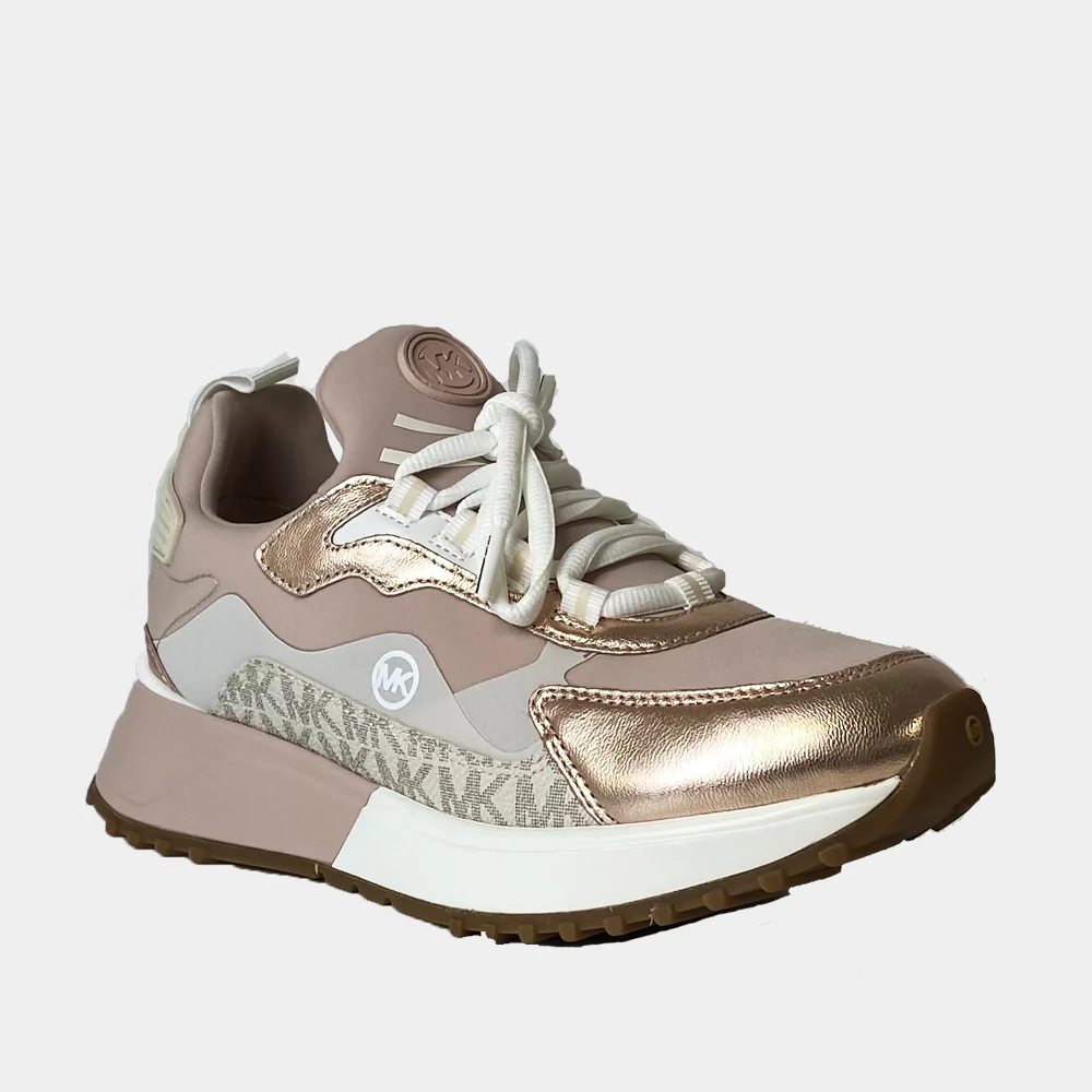 Adoptez un style décontracté avec les sneakers Michael Kors Theo Sport en cuir métallisé, nylon et monogramme rose et beige. Découvrez toute la collection de chaussures Michael Kors sur Ann Tuil.