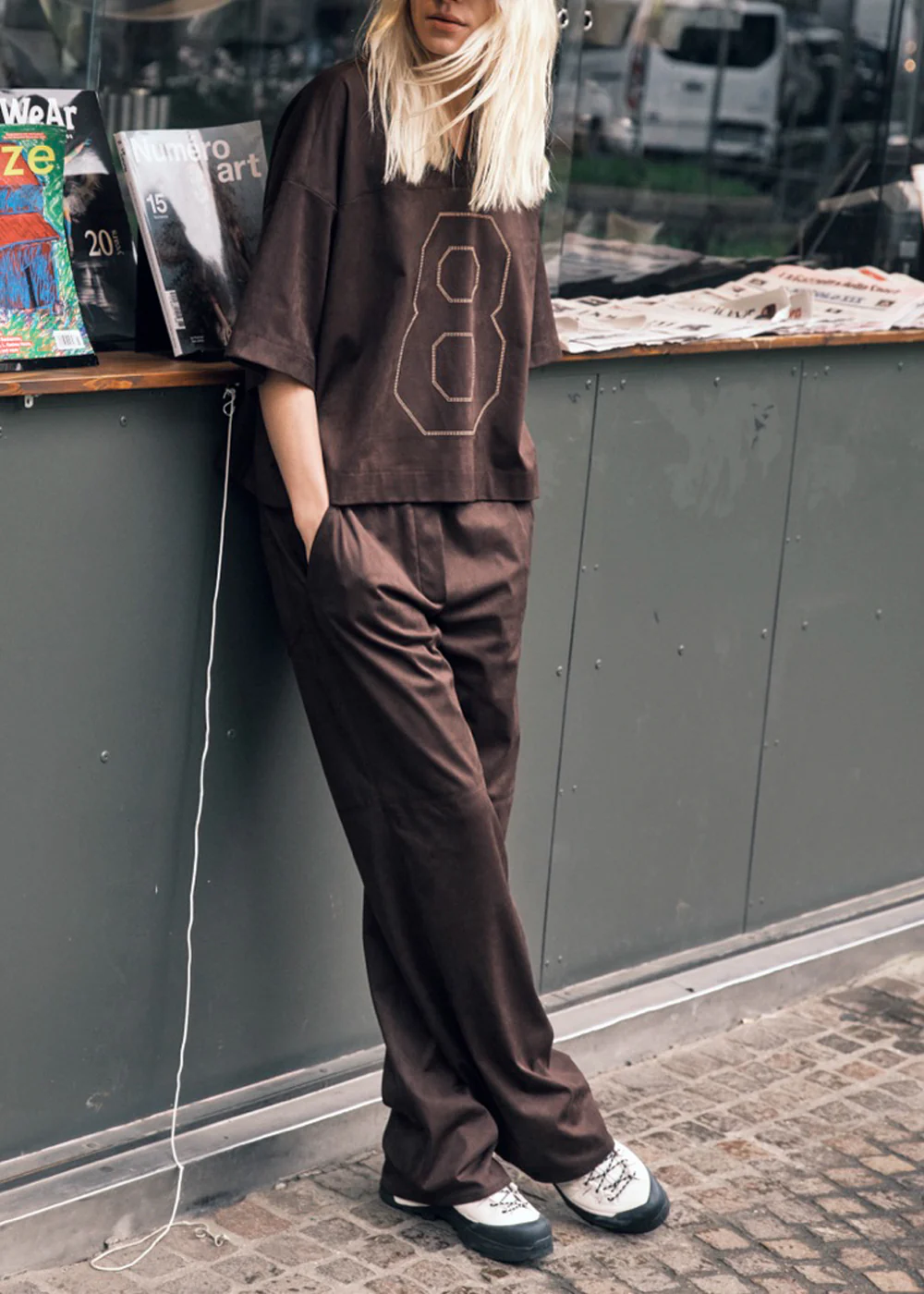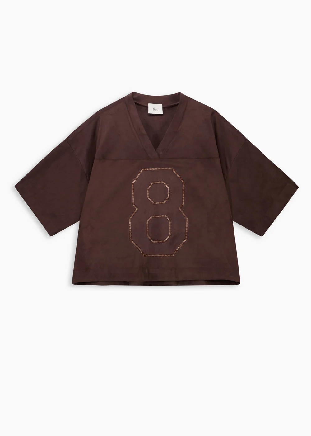 La blouse style t-shirt 8PM modèle marron DP8PM52B05 allie confort et style dans un esprit résolument décontracté. Son col V flatteur et ses manches larges offrent une silhouette fluide, tandis que le logo clouté ton sur ton sur le devant apporte une note lumineuse et moderne. Parfait pour un look effortless, du matin au soir.