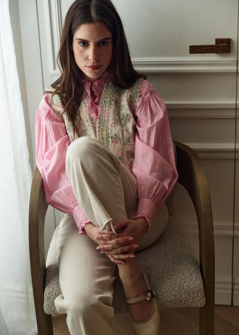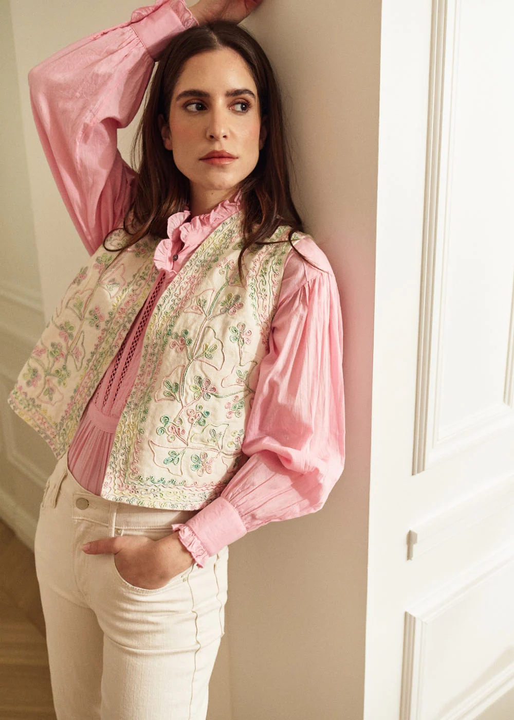 - Poignets, patte de boutonnage et col volantés