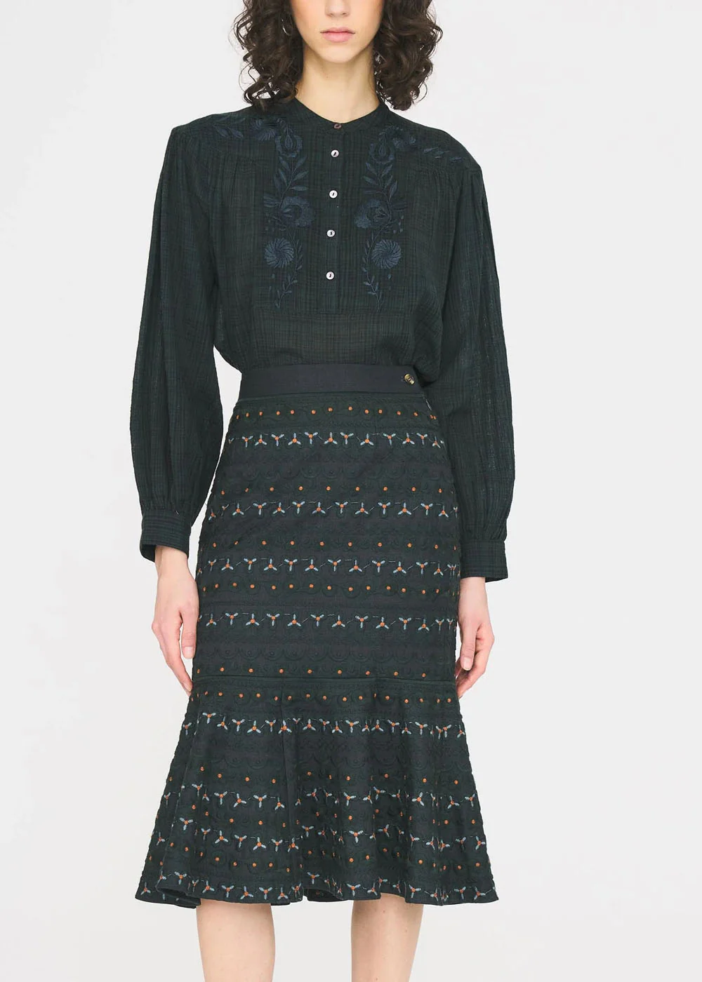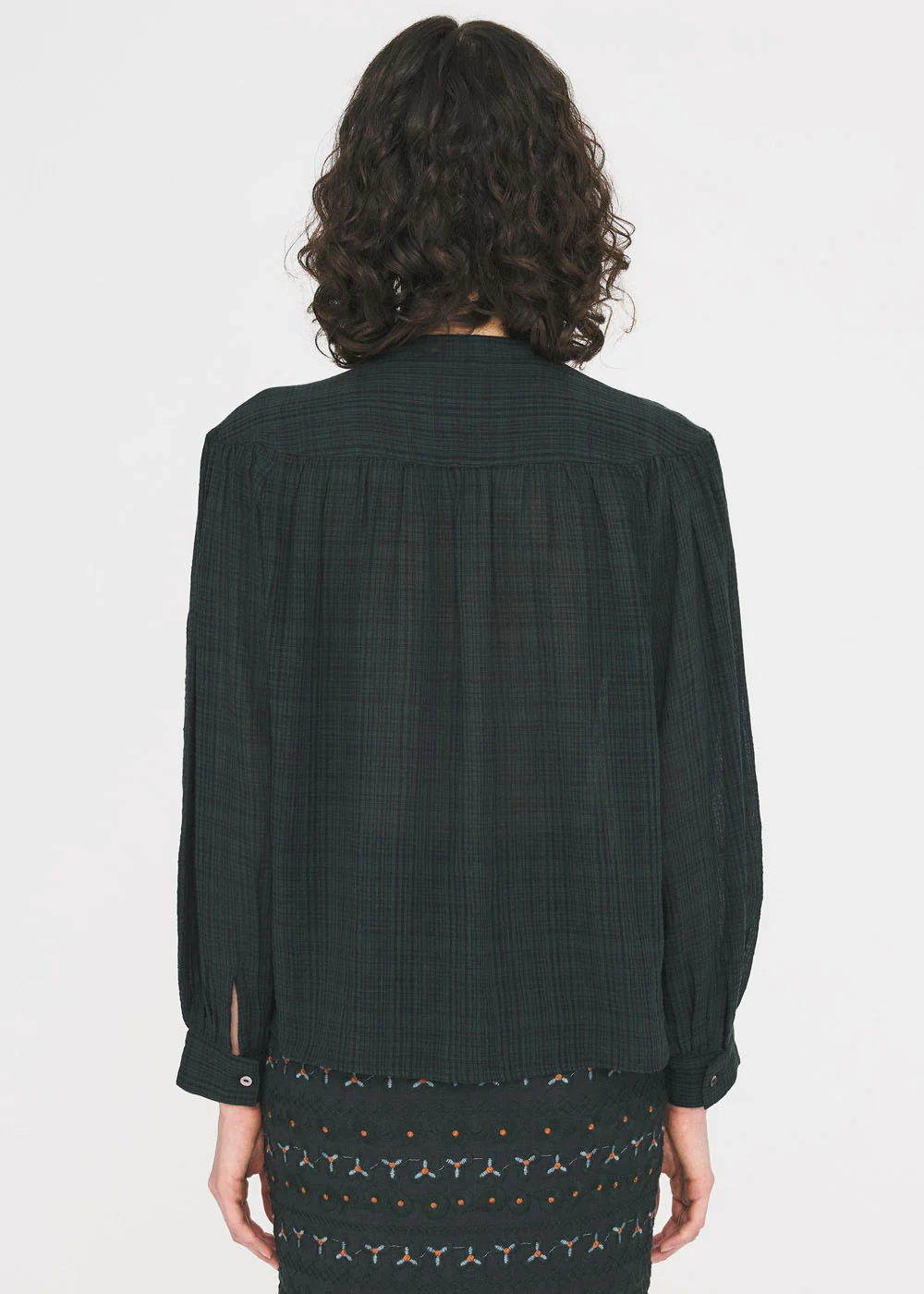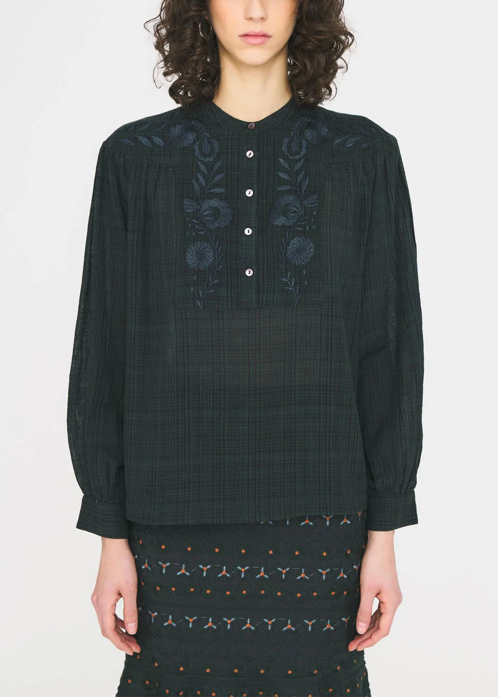Blouse légère subtilement brodée de motifs floraux, pour une allure à la fois romantique et intemporelle. Chaque détail de la broderie apporte relief et délicatesse à la silhouette. Un essentiel raffiné du vestiaire féminin.