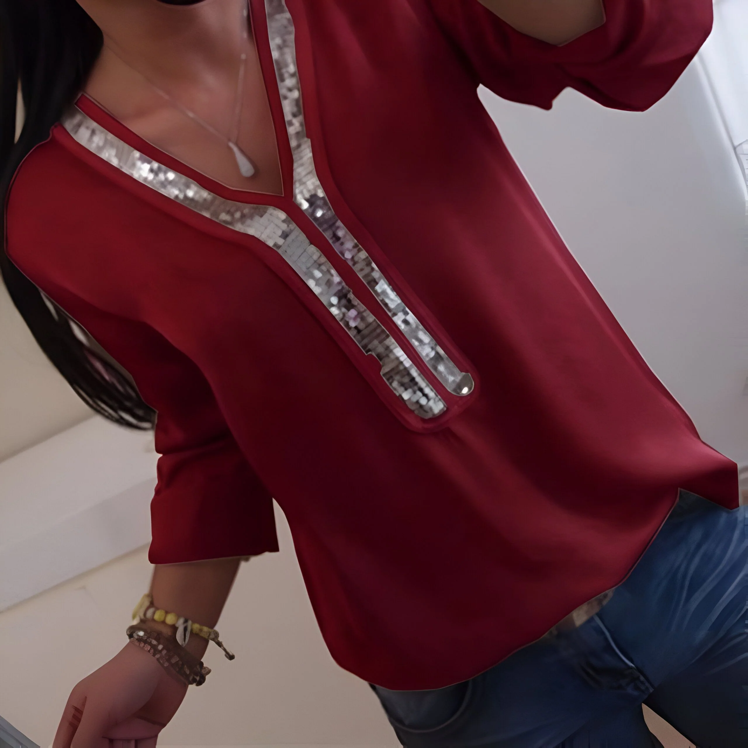 Cette blouse à sequins est une pièce unique, spécialement conçue pour nos clientes les plus exigeantes. Vous ne la trouverez nulle part ailleurs, que sur notre site en ligne. C’est l’assurance d’un style original et personnel, qui vous permettra de vous démarquer de la foule. En choisissant cette blouse, vous optez pour une pièce exclusive, un véritable bijou de mode qui vous accompagnera dans toutes vos aventures. Profitez de ce privilège et commandez dès maintenant votre blouse avant qu’il ne soit trop tard, car les stocks sont limités.