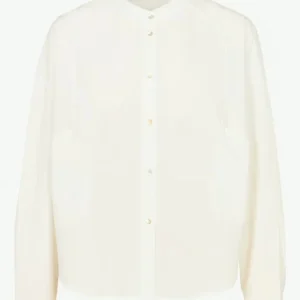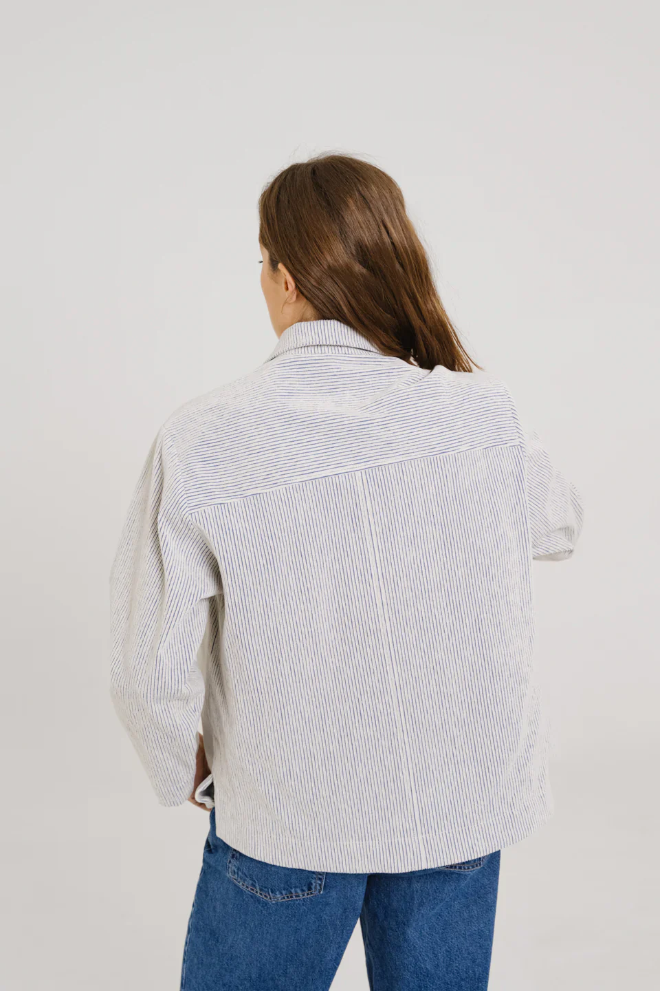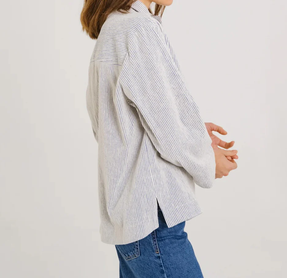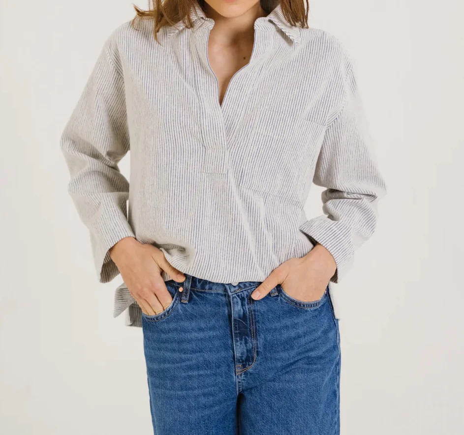 Blouse à col esprit vareuse, confectionnée en coton à rayures velours bleu et écru. Ses emmanchures basses et ses poches poitrine lui donnent une allure décontractée, tandis que les fentes côtés apportent fluidité et liberté de mouvement. Sans boutonnage, elle se distingue par des finitions épurées pour un style à la fois graphique et contemporain.