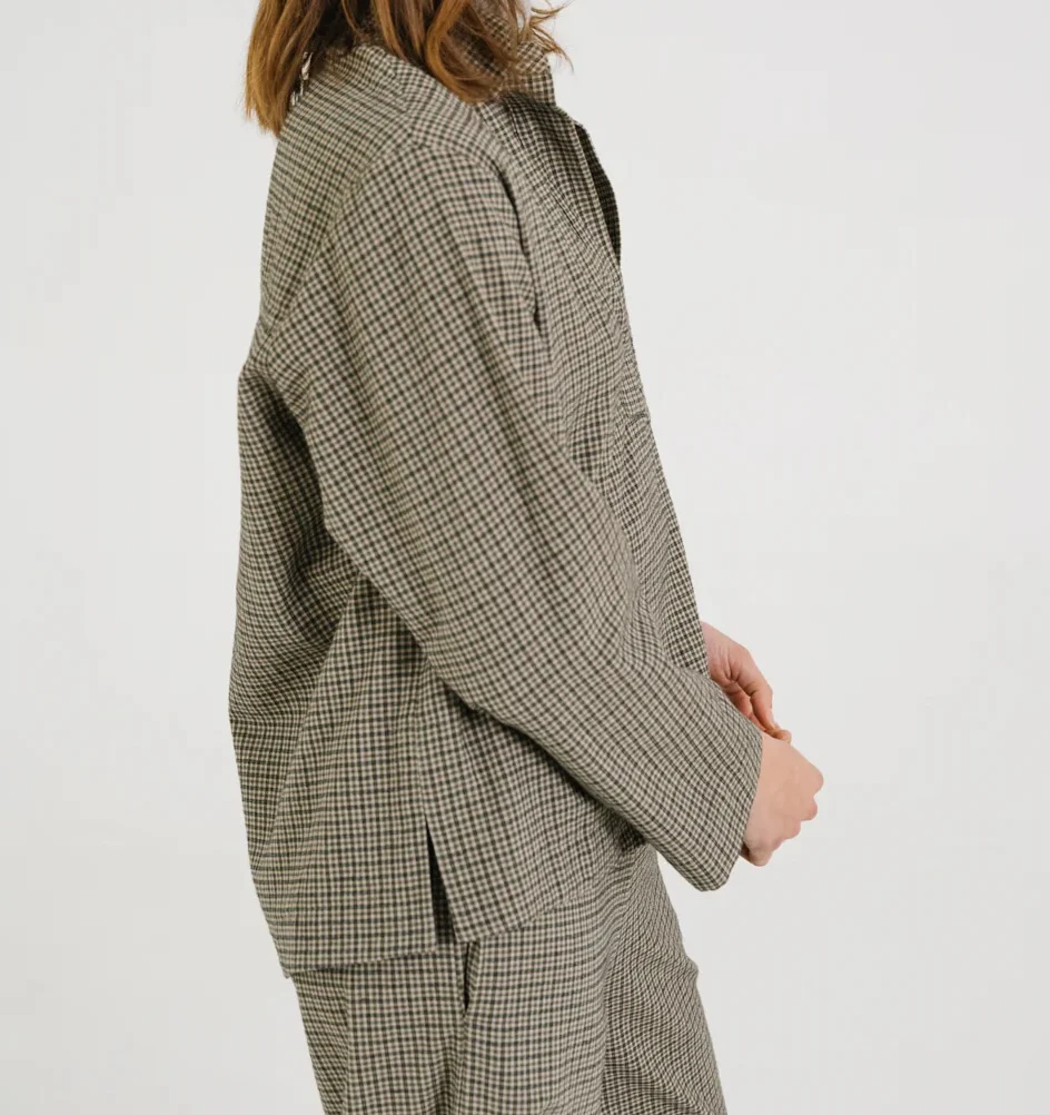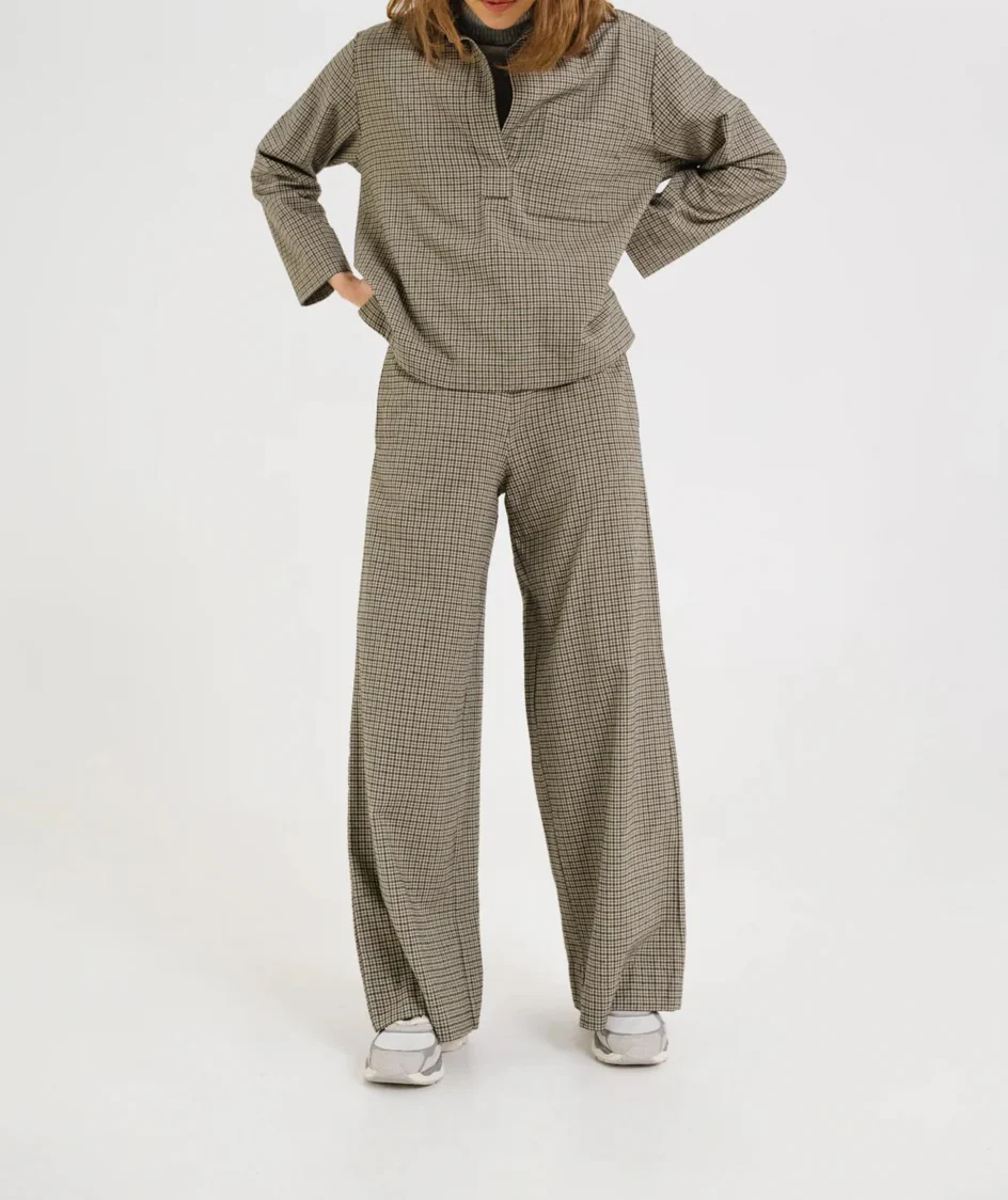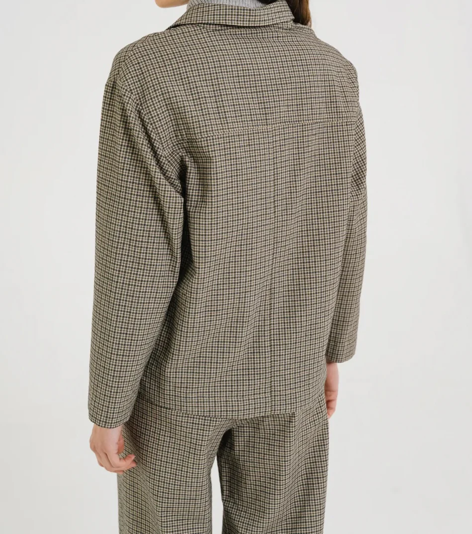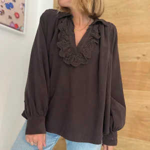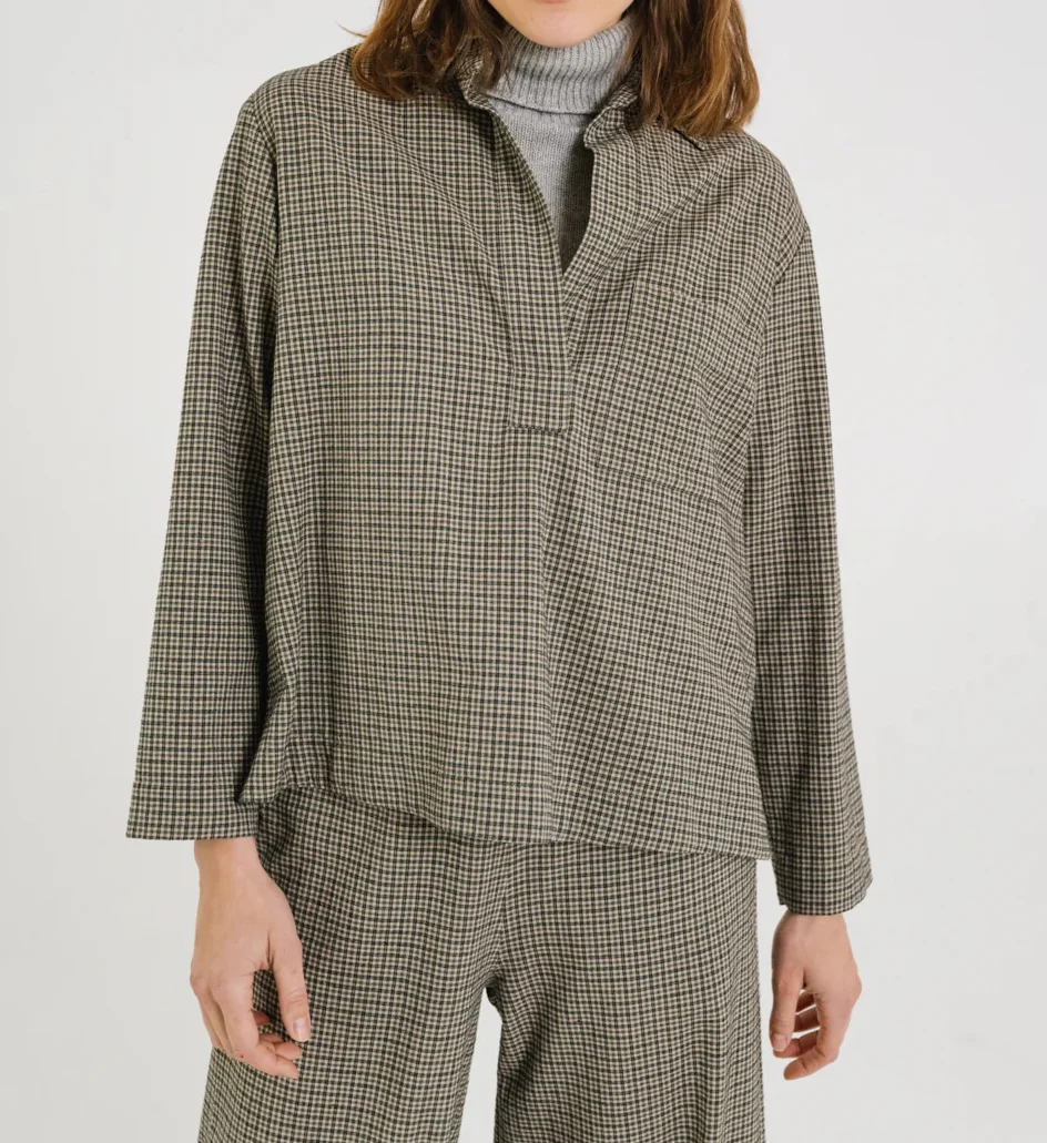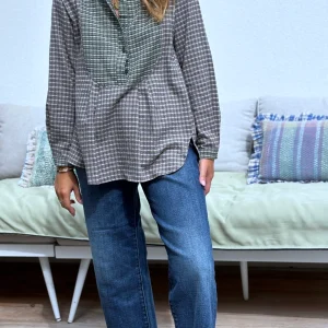 Blouse à col esprit vareuse, confectionnée en coton à rayures velours bleu et écru. Ses emmanchures basses et ses poches poitrine lui donnent une allure décontractée, tandis que les fentes côtés apportent fluidité et liberté de mouvement. Sans boutonnage, elle se distingue par des finitions épurées pour un style à la fois graphique et contemporain.