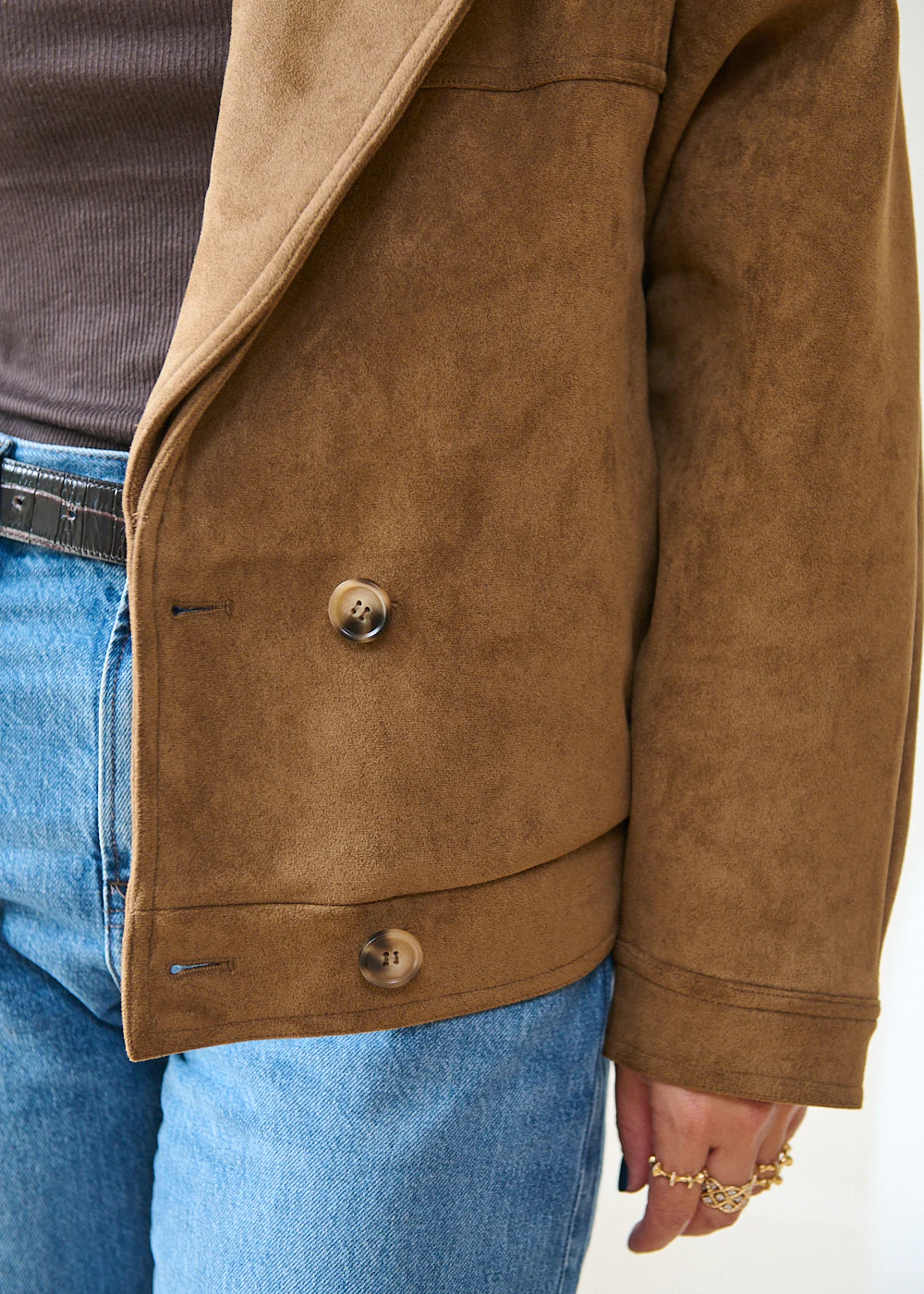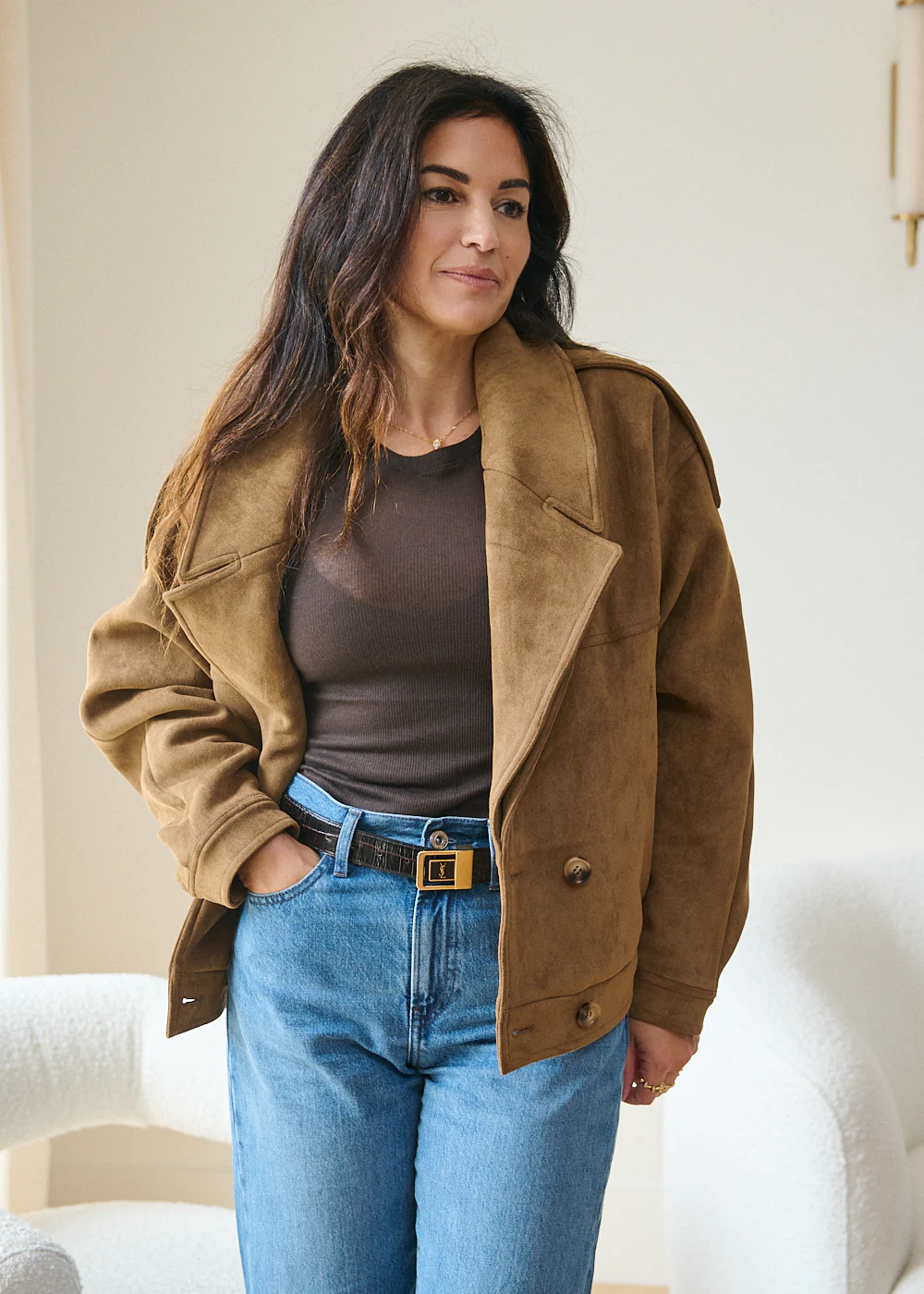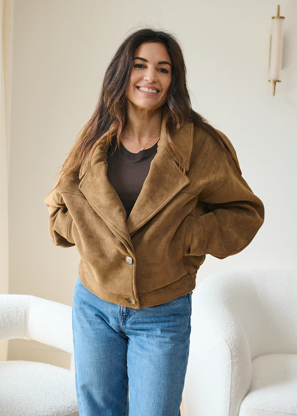 Le blouson court Ann Tuil modèle EFW250014 offre un style à la fois décontracté et structuré. Doté d’un large col à revers et d’une fermeture boutonnée, il apportera une touche contemporaine à votre look. Sa coupe oversize avec des épaules tombantes accentue son allure moderne, tandis que sa matière douce lui confère un aspect chaleureux et élégant.