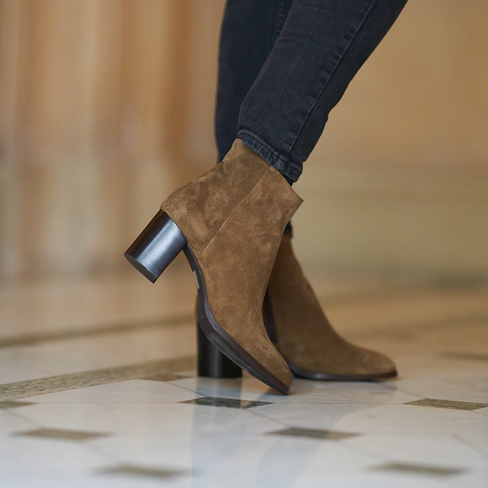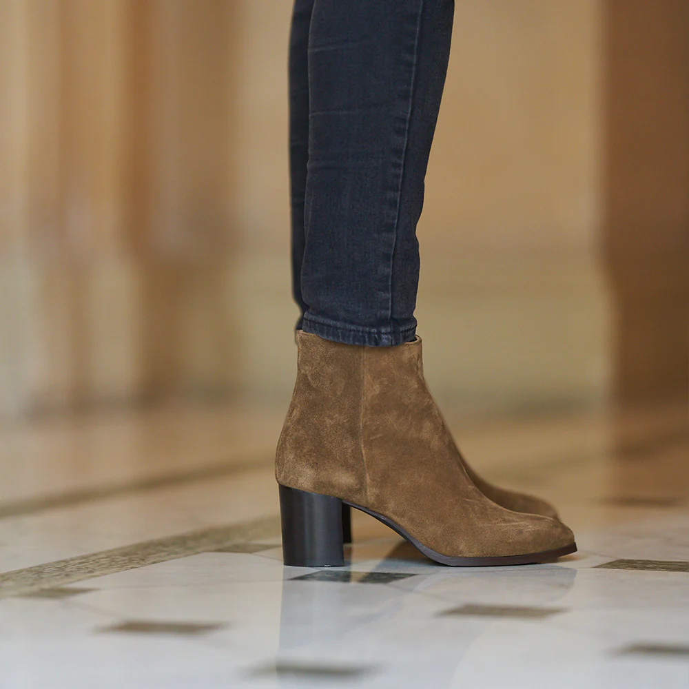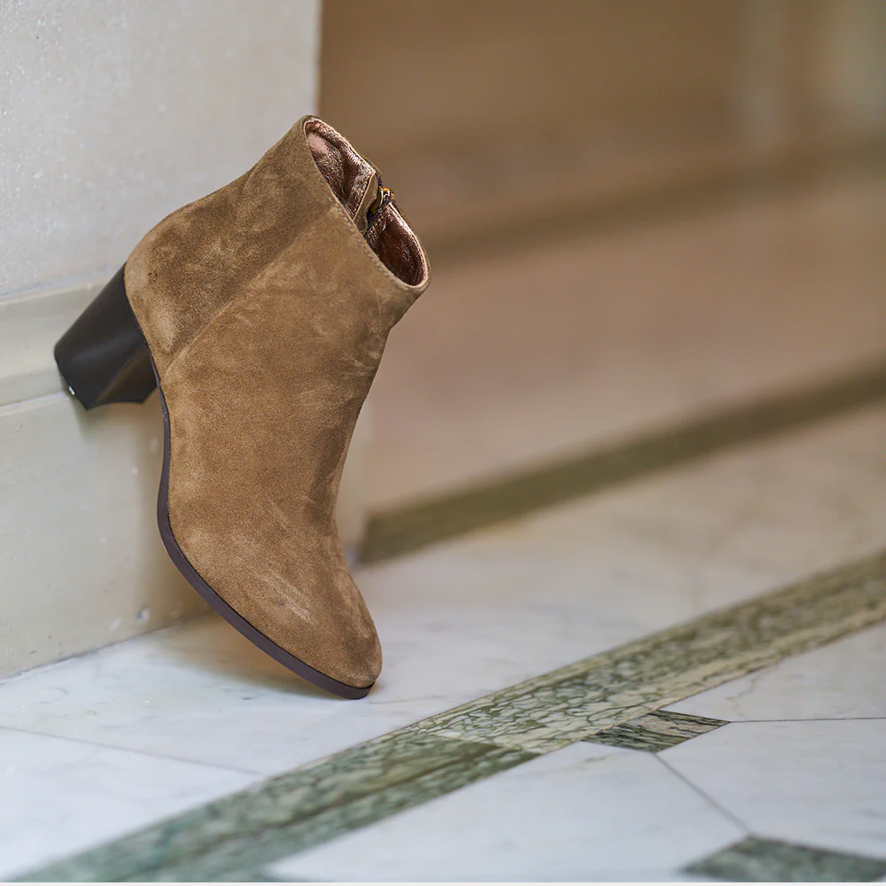 Véritable must-have ! Les boots modèle Lady en velours taupe allient chic et élégance. Découvrez toute la collection de chaussures sur Ann Tuil.