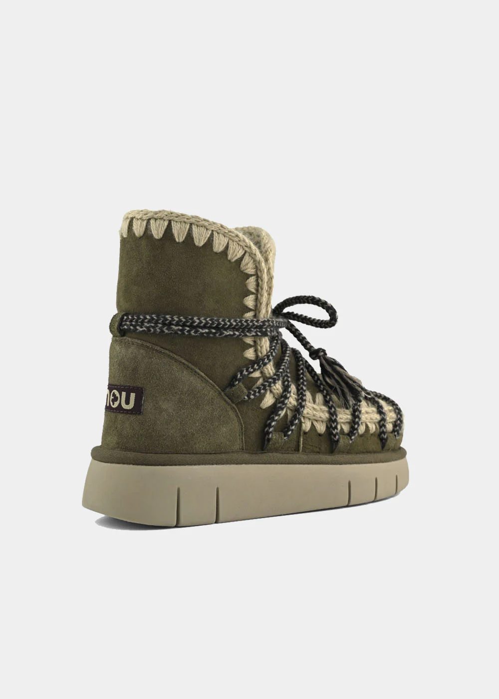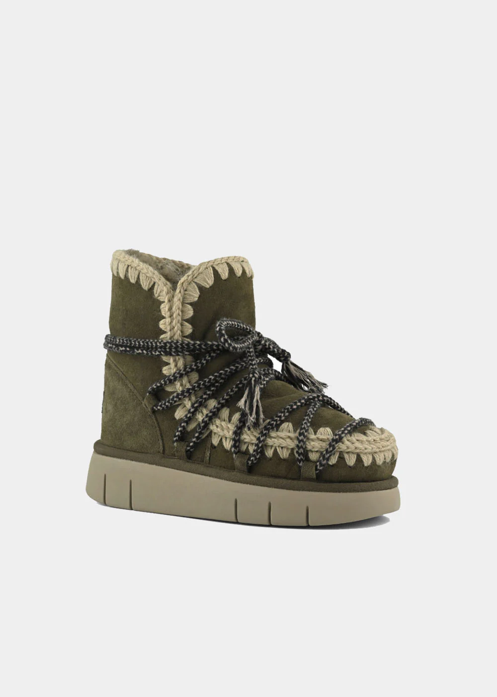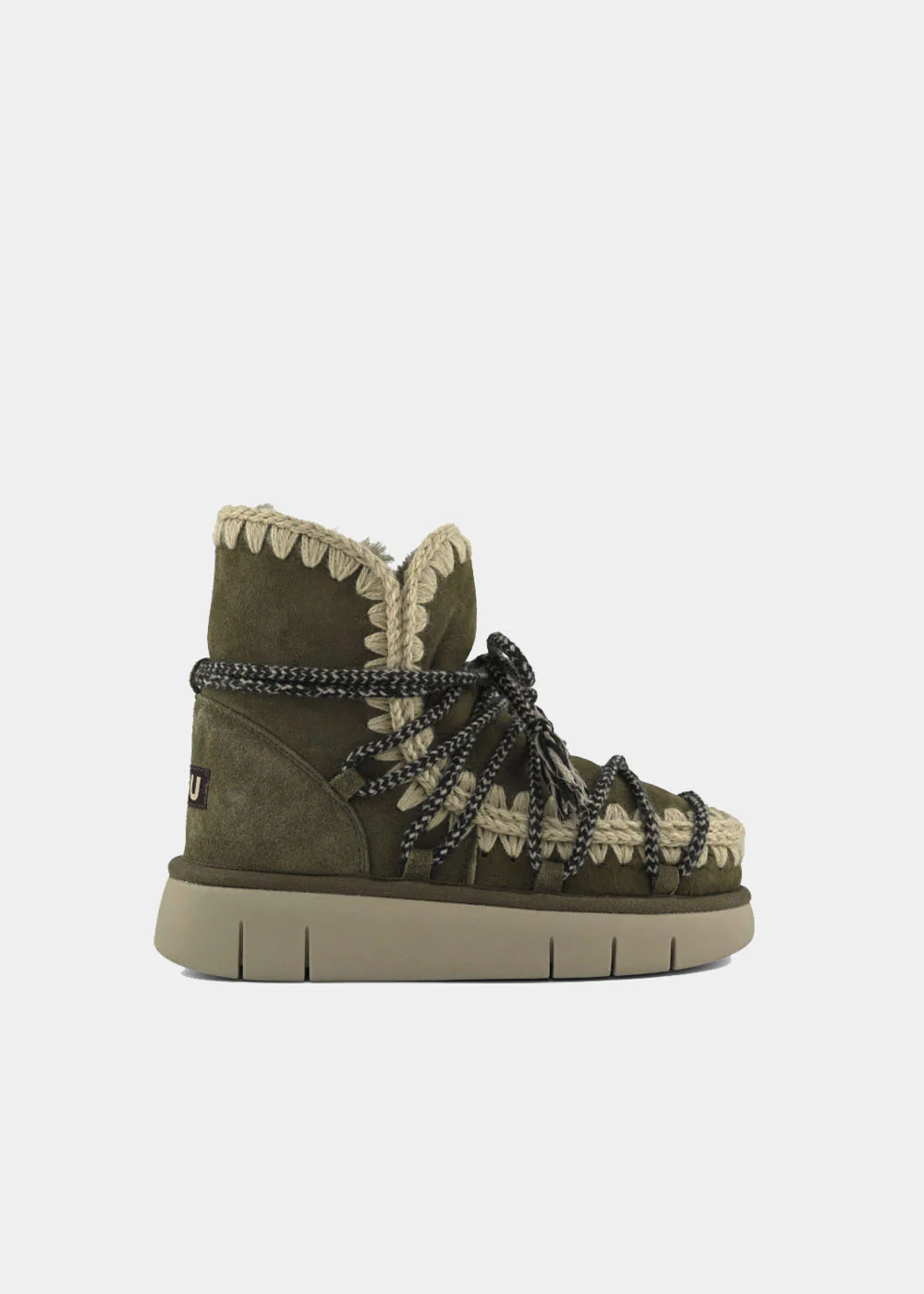 Nouveauté de la saison automne-hiver 2025, la botte Mou Bounce à lacets Scoubidou est confectionnée artisanalement en peau de mouton double face divinement chaude, avec les coutures en laine crochetées main emblématiques de Mou, un contrefort de talon et une semelle extérieure en EVA et caoutchouc. Incroyablement confortable et résistante.