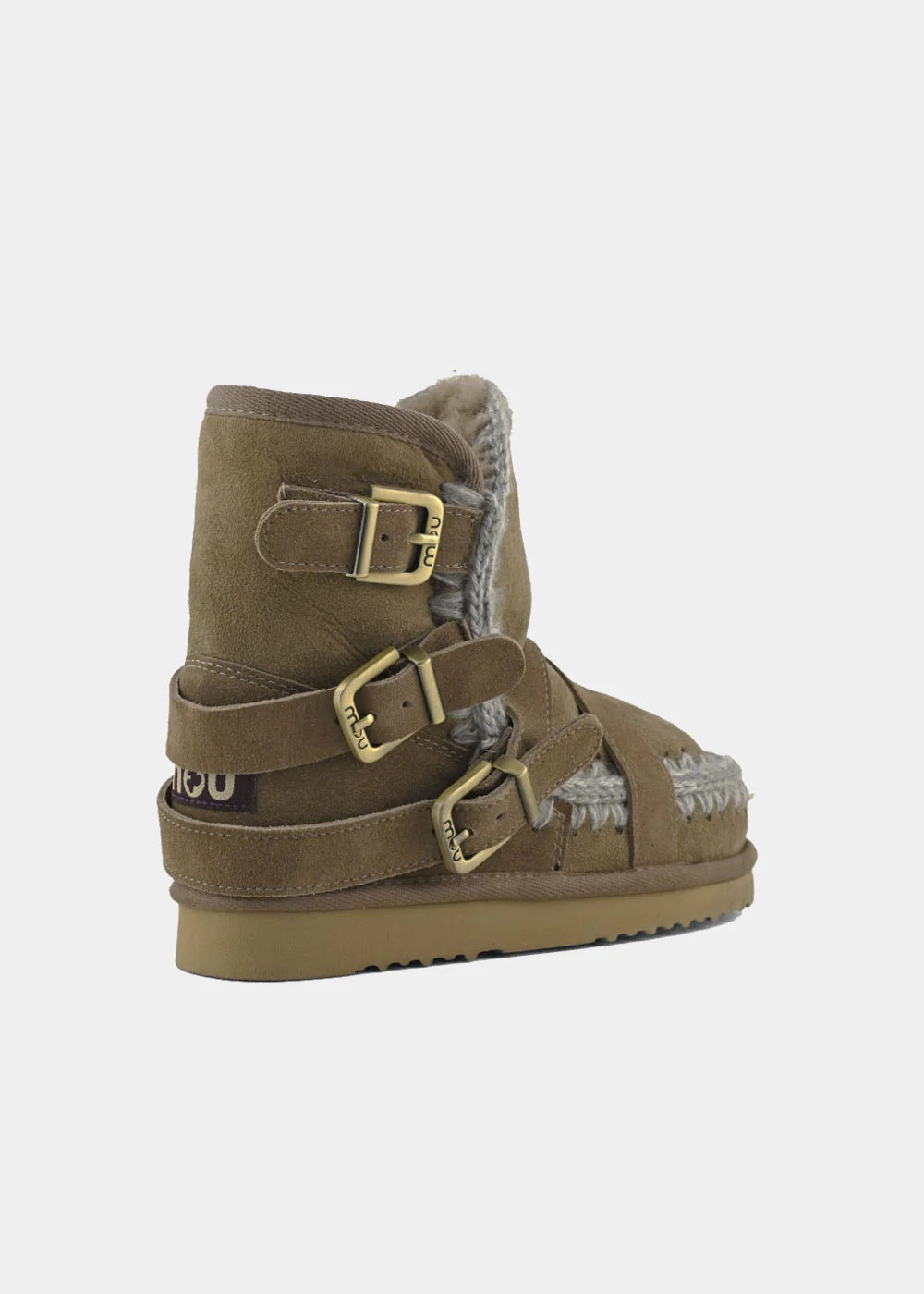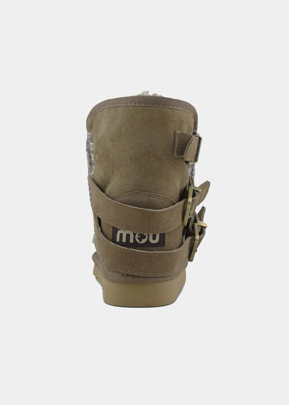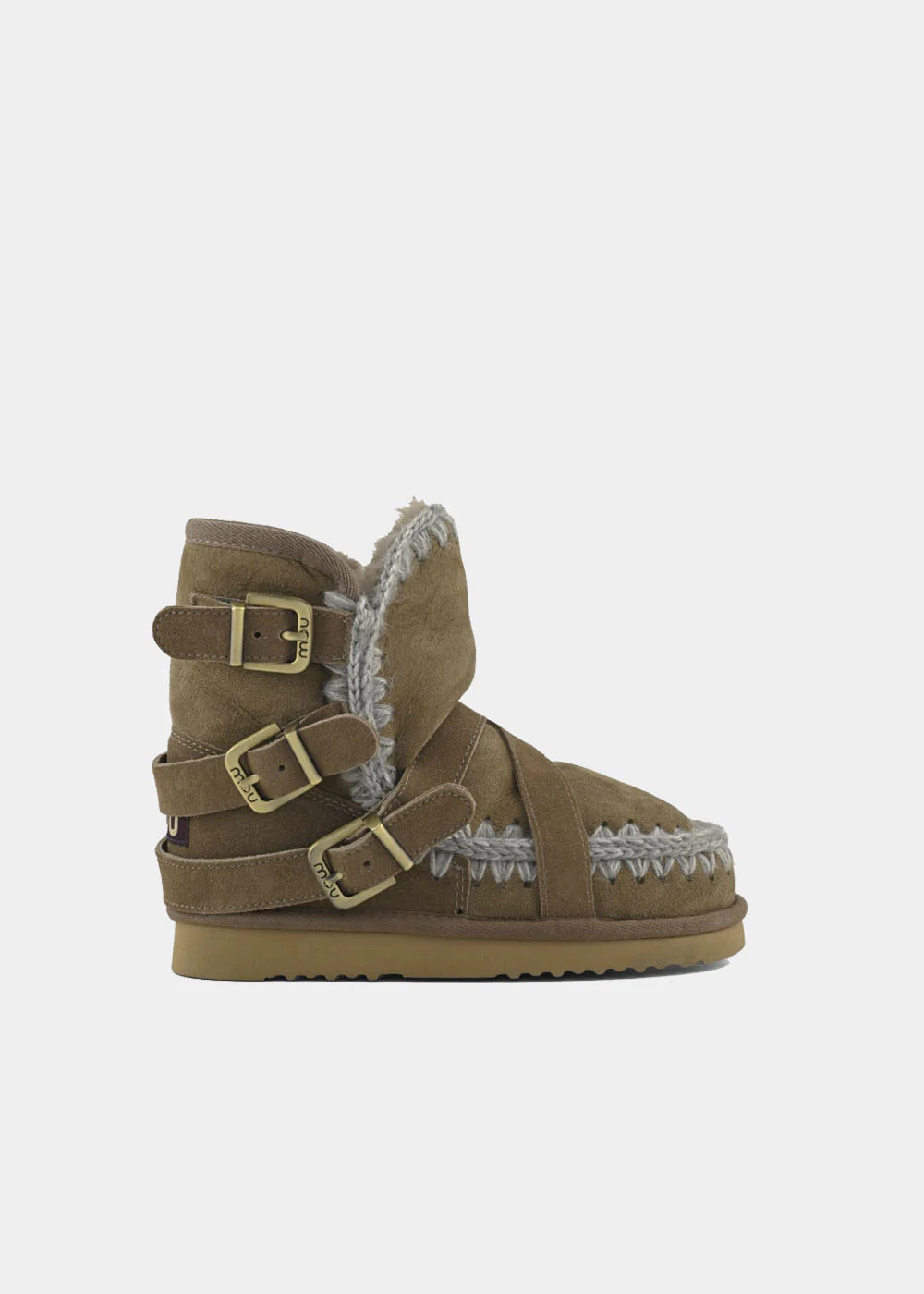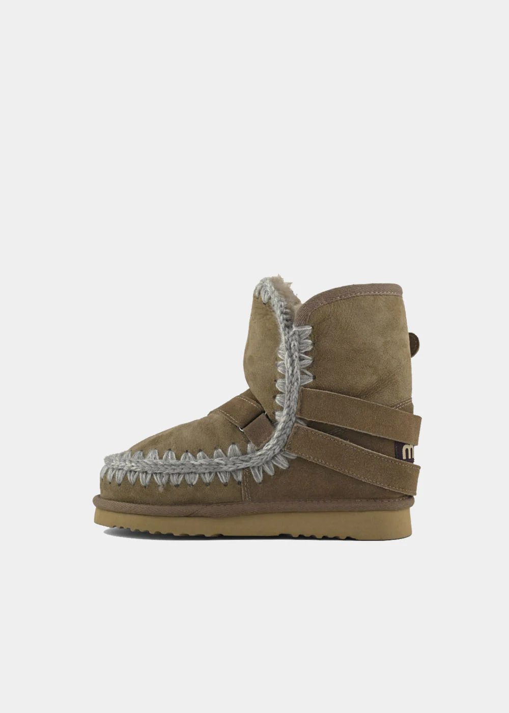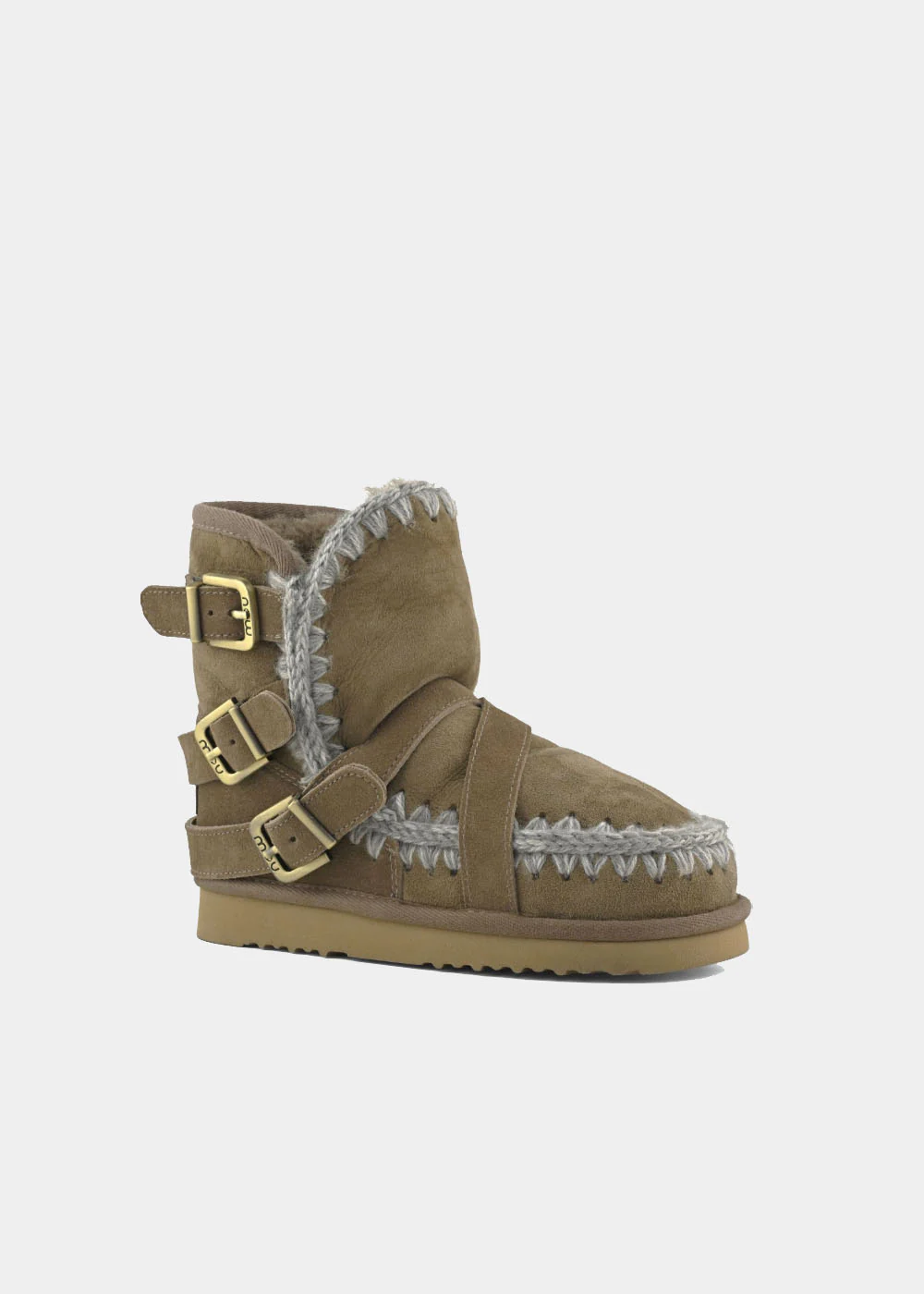 La boots Mou Eskimo 18 Buckl est revisitée avec des brides à boucle et arbore les coutures en laine crochetées main, signature de Mou. Fabriquée artisanalement en peau de mouton double face de première qualité, elle est dotée d’un contrefort de talon et d’une semelle extérieure en EVA et caoutchouc, pour un confort et une résistance exceptionnels.