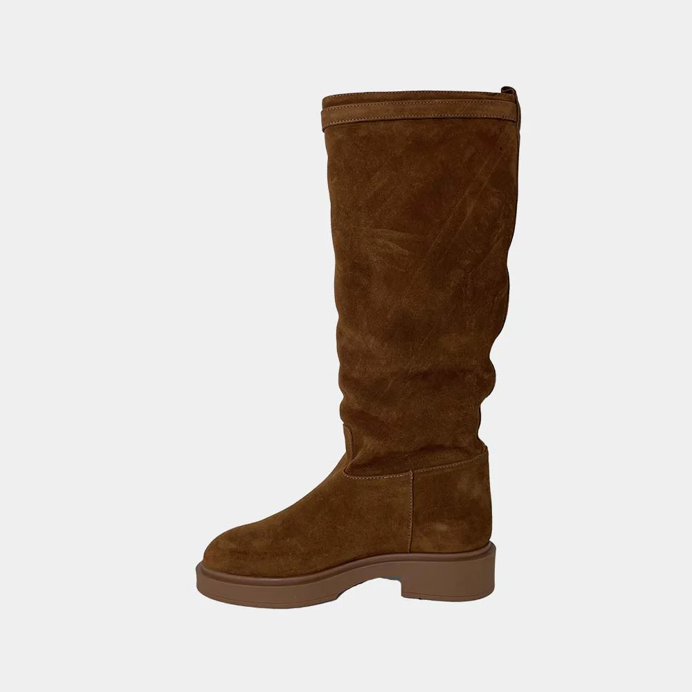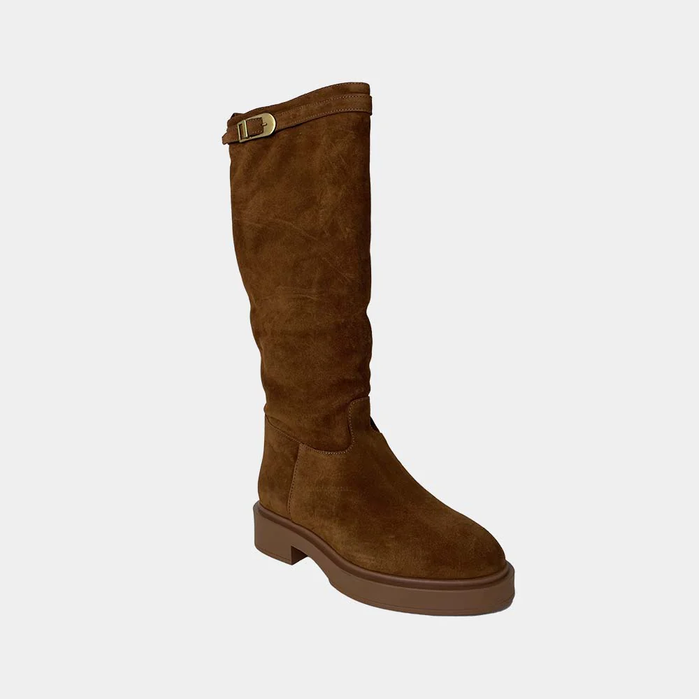 Découvrez dès maintenant notre remarquable collection de bottes et explorez le modèle LOE BIS M1048 en velours camel. Ce modèle met en avant un petit talon plat de 4,00 cm ainsi qu’une tige haute ornée d’une boucle dorée.