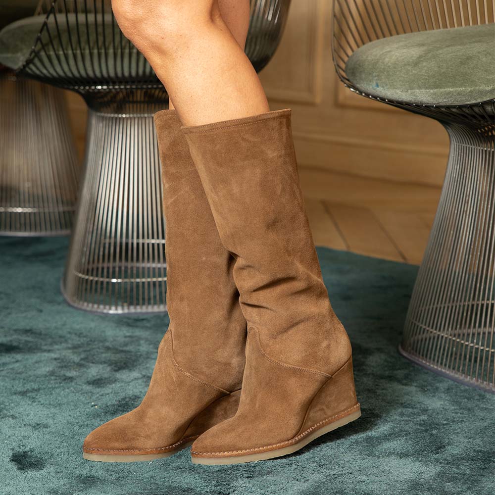 Découvrez nos magnifiques bottes compensées Macaron en taupe foncé : l’union parfaite entre finesse et confort pour sublimer vos jambes. Dotées d’un talon compensé offrant une stabilité inégalée, ces bottes en velours taupe foncé à bout pointu sont un incontournable pour la saison automne-hiver. Profitez de l’alliance du style et du bien-être avec nos bottes exceptionnelles.