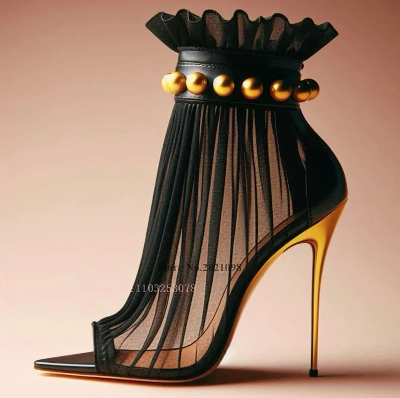 Bottines à talons aiguilles et bout pointu en maille noire avec clous dorés