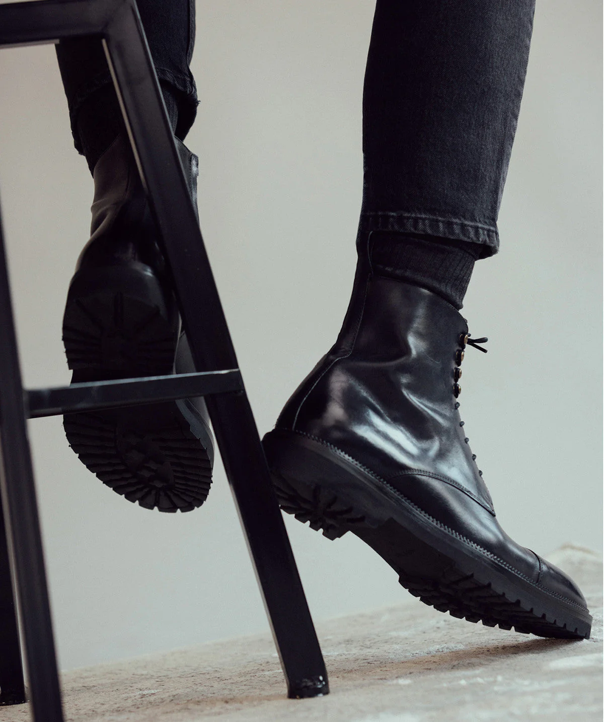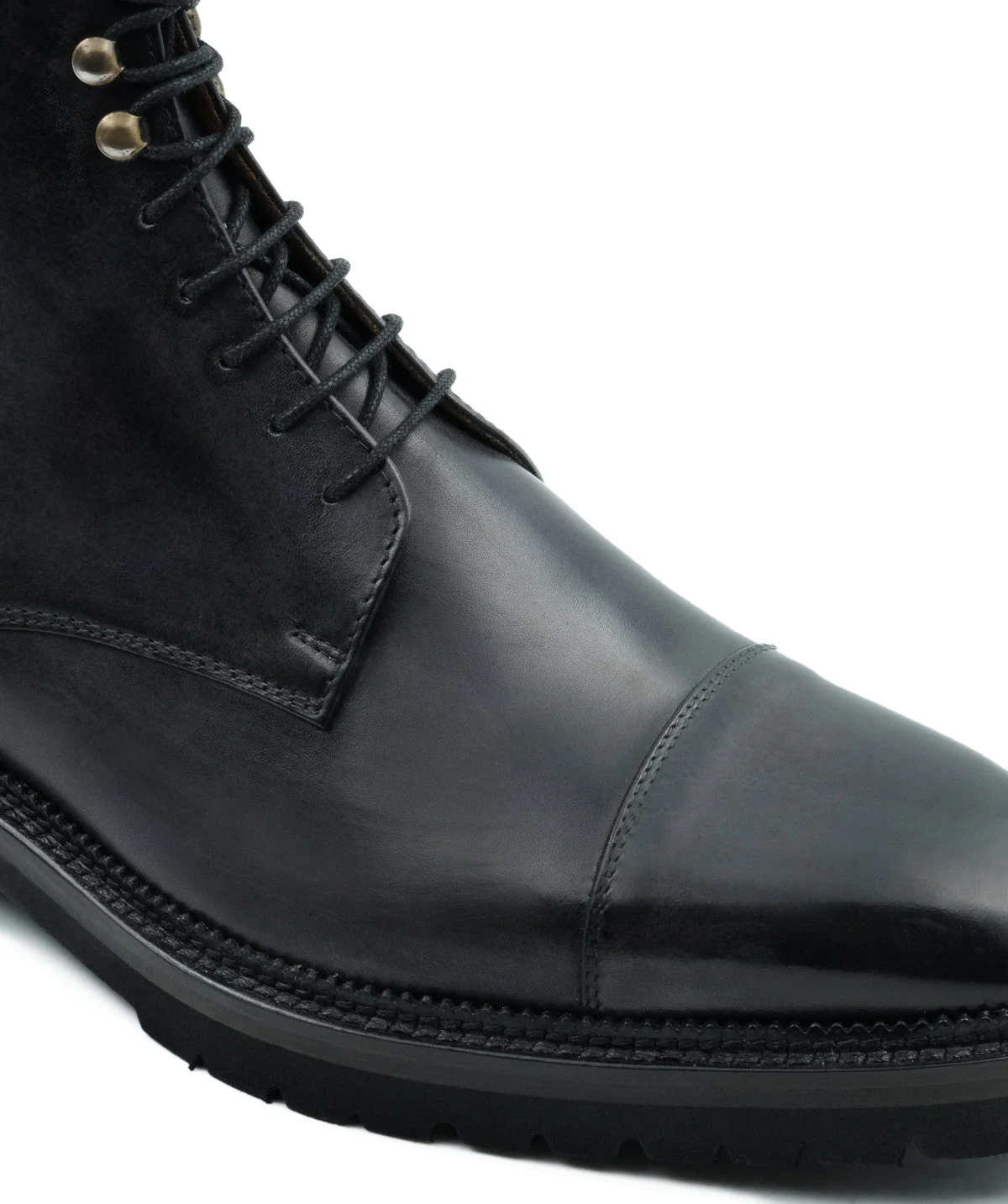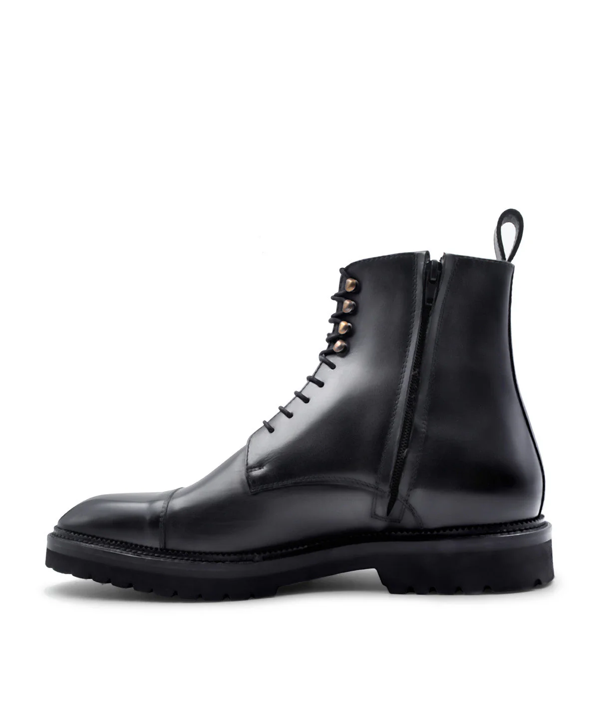 Entretien : Le cuir étant une matière vivante, il est primordial de l’hydrater régulièrement afin d’optimiser sa souplesse mais aussi son imperméabilité et sa longévité. La bonne fréquence est de cirer ses souliers tous les 4 à 5 ports. En respectant les règles d’alternance (REGLE 2) cela équivaut à cirer vos souliers 2 à 3 fois par mois en moyenne voire toutes les semaines si vous n’avez que deux ou trois paires. Soyez tendance et confortable dans vos chaussures avec ce nouveau modèle « rustique » revisité à la pointe de la modernité, les bottines Alessandro Gris Patiné Finsbury seront parfaites pour affronter le froid. Un design épuré avec un cuir de veau italien. Avec leur style original, ces boots vous donneront un look casual chic. Le modèle Alessandro Gris patiné habillera vos pieds jusqu’en haut de la cheville avec un zip latéral sur coté intérieur, et 4 crochets de laçages donnant un look néo-dandy. Son montage en cousu Blake en fait un produit d’une qualité irréprochable et robuste. La semelle gomme de type commando 4×4 « ultra light » vous apportera un confort au pied incomparable pour toutes les occasions. Elle est aussi chic que pratique pour se déchausser sans défaire les lacets, grâce à sa fermeture éclair toute hauteur. Le modèle Alessandro Gris patiné est issue notre gamme de produits Tradizione, made in Italie, le très haut de gamme de la maison Finsbury entièrement patiné et finis à la main. Ce modèle est également disponible en gris patiné.