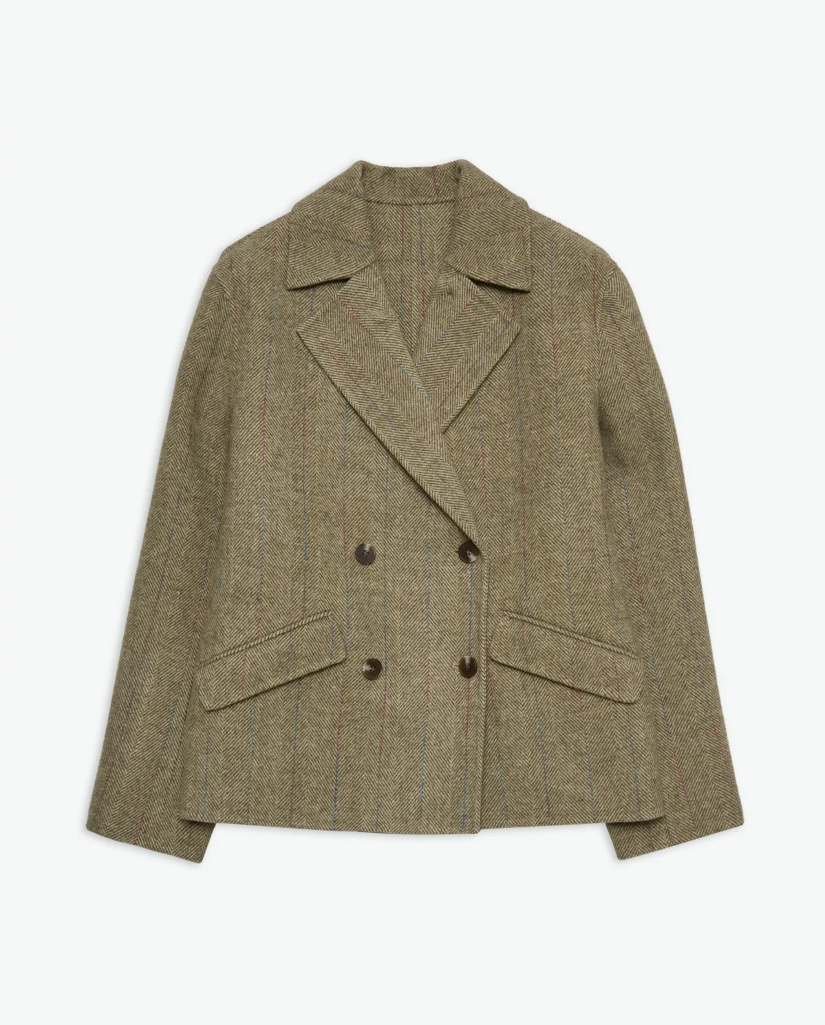 Coupe droite. Col à revers. Manches longues. Fermeture à double boutonnage.