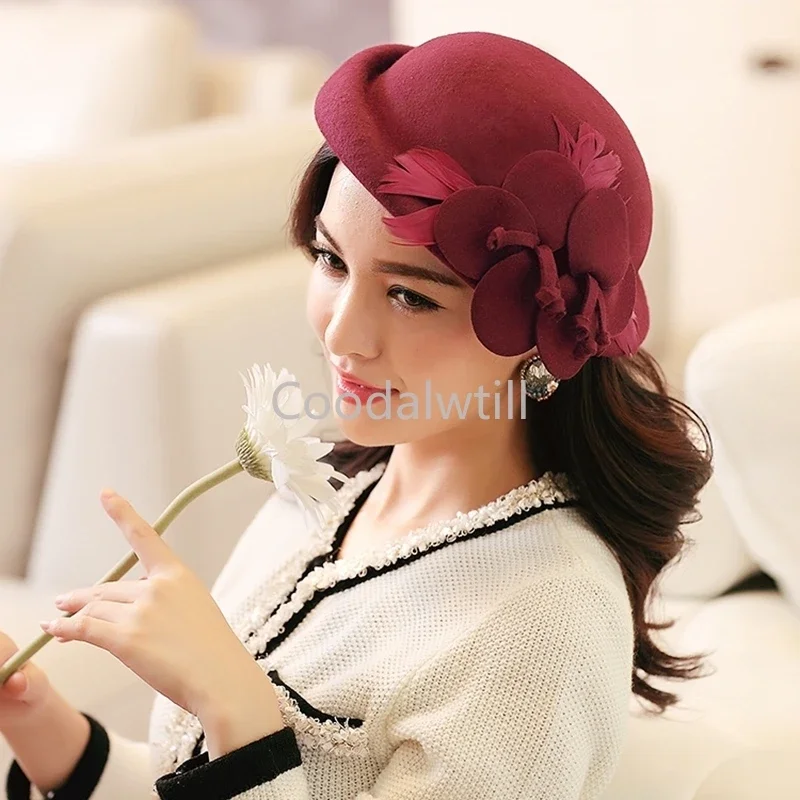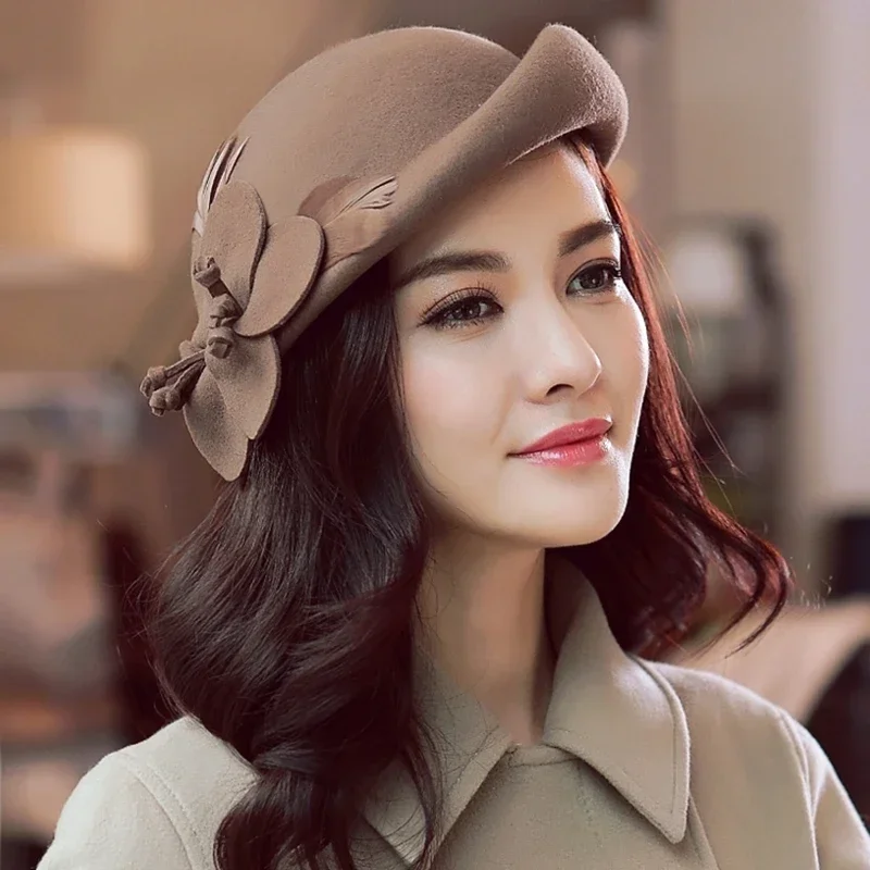 Chapeau cloche vintage d’hiver en feutre 100 % laine pour femme avec bord rabattu et fleur