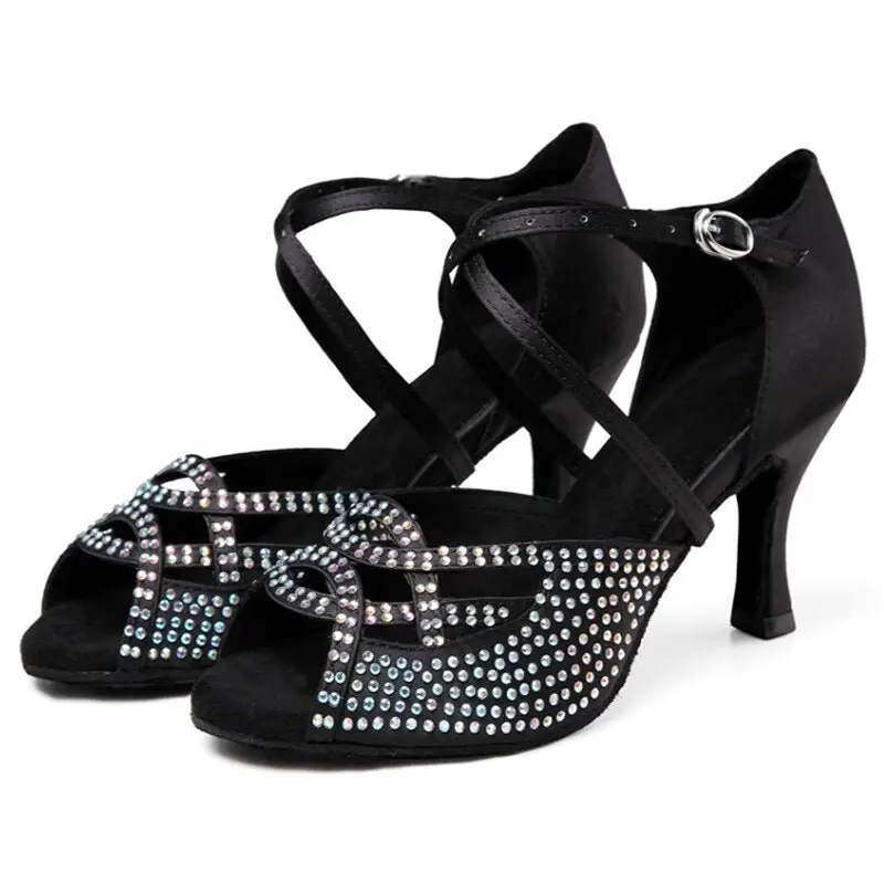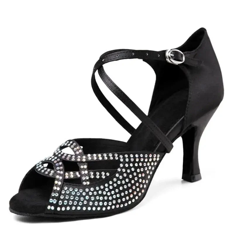Le dessus de cette magnifique paire de chaussures de danse latine est faite en satin de soie et orné par des strass pour plus d’originalité.