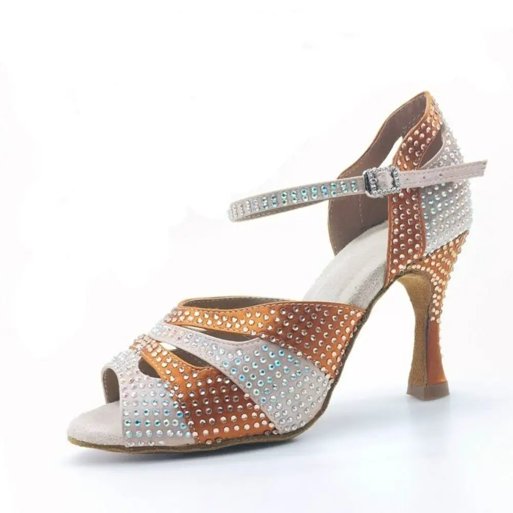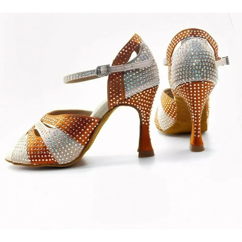 Ce modèle de Chaussure de Salsa Femme est unique en son genre. Ces chaussures de danse bi couleur marrons et blanches strassées, modèle IRIS, rendront vos looks de danseuses exceptionnels.
