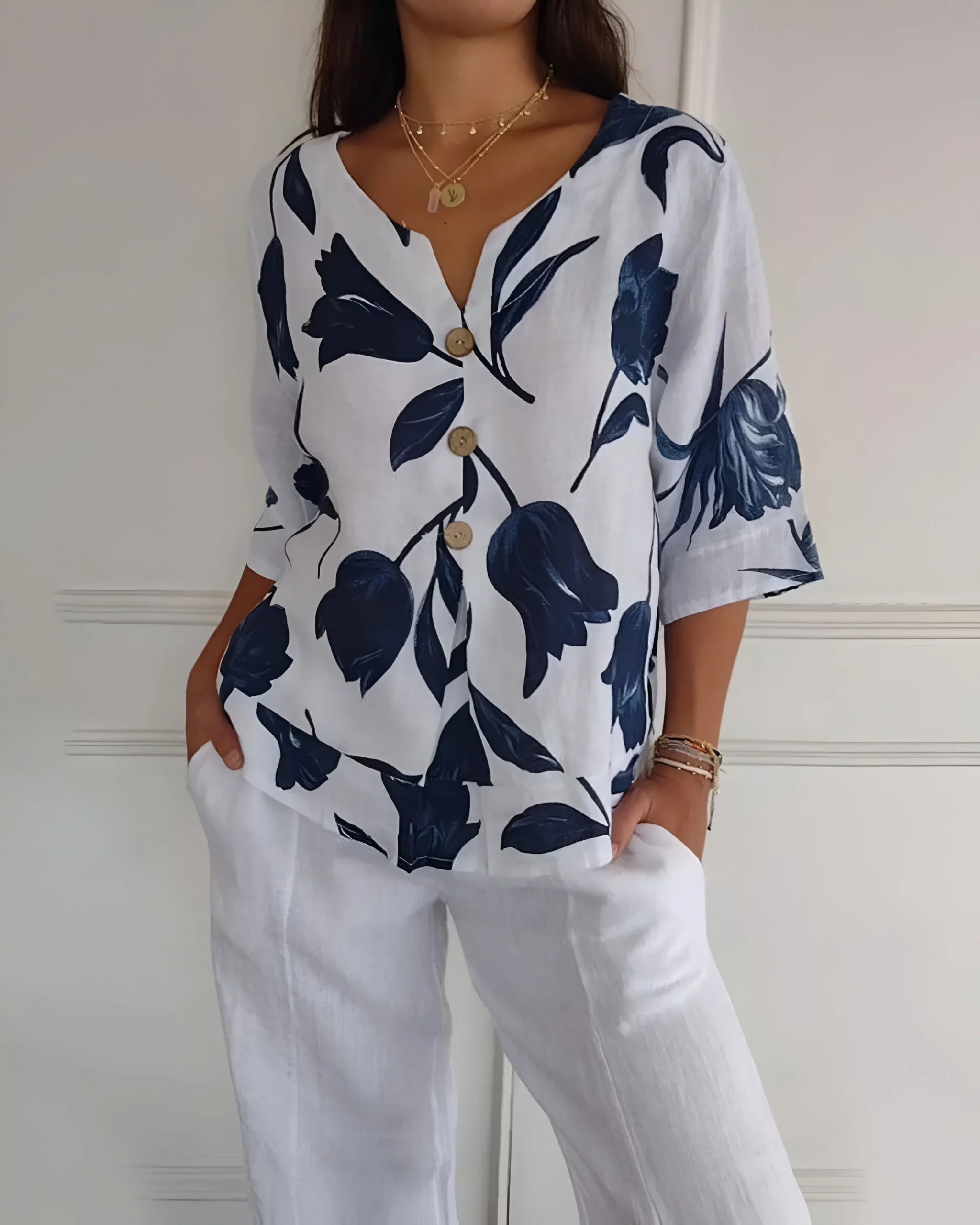Le motif fleuri de cette chemise est plus qu’un simple détail, c’est une déclaration de style. Les fleurs stylisées, élégamment disposées sur un fond clair, apportent une touche de fraîcheur et de romantisme à votre tenue. Que vous la portiez avec un jean, une jupe ou un pantalon léger, cette chemise s’adapte à toutes les occasions et vous permet de créer des looks variés et sophistiqués sans effort. Sa coupe ample et fluide assure une aisance de mouvement, parfaite pour vos journées actives, que ce soit au bureau ou en promenade.