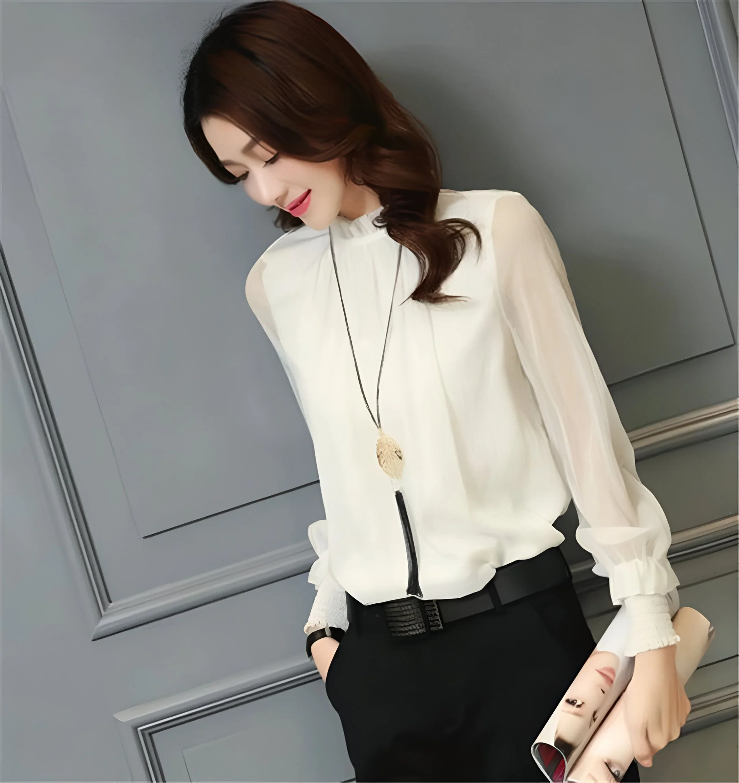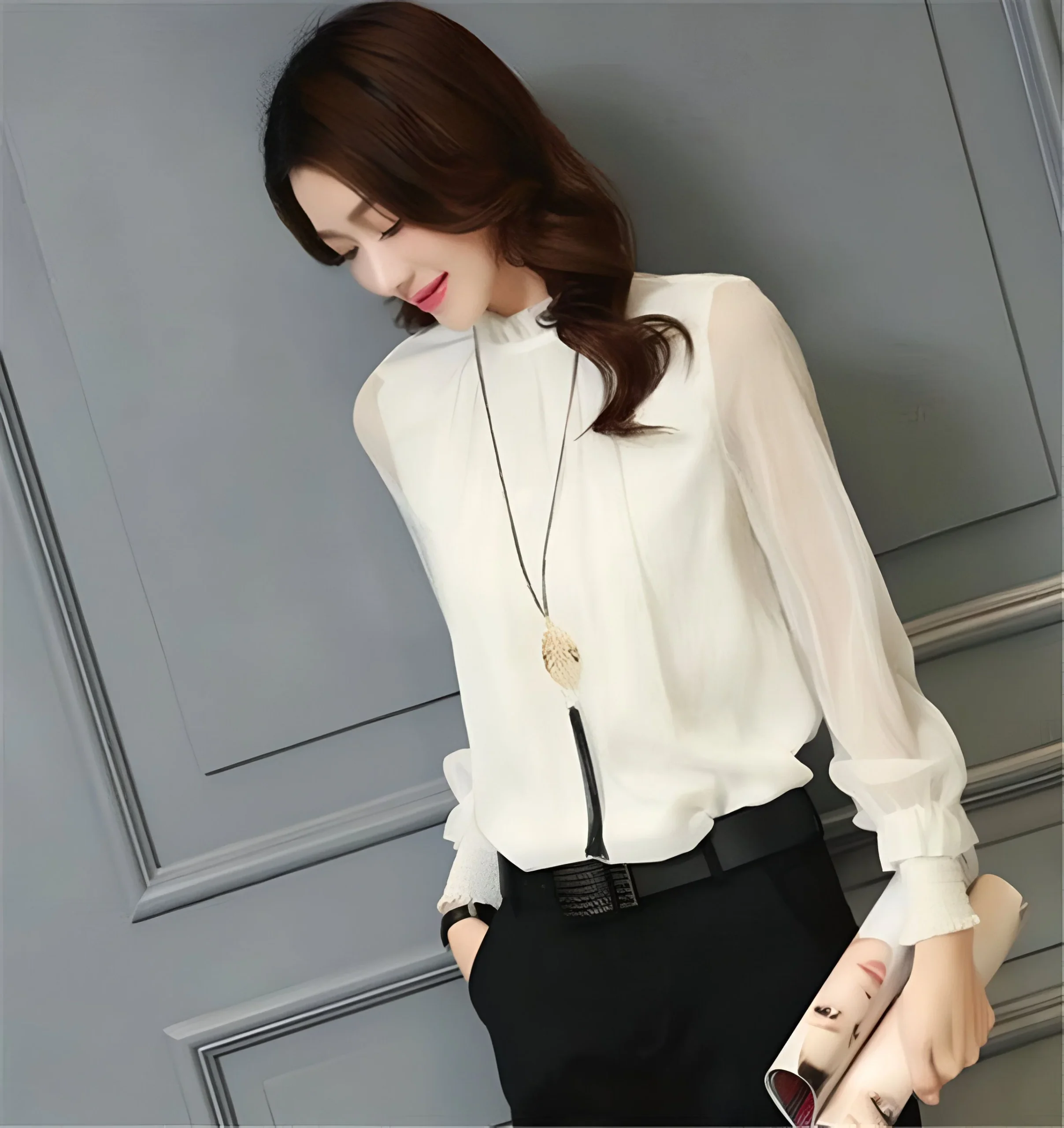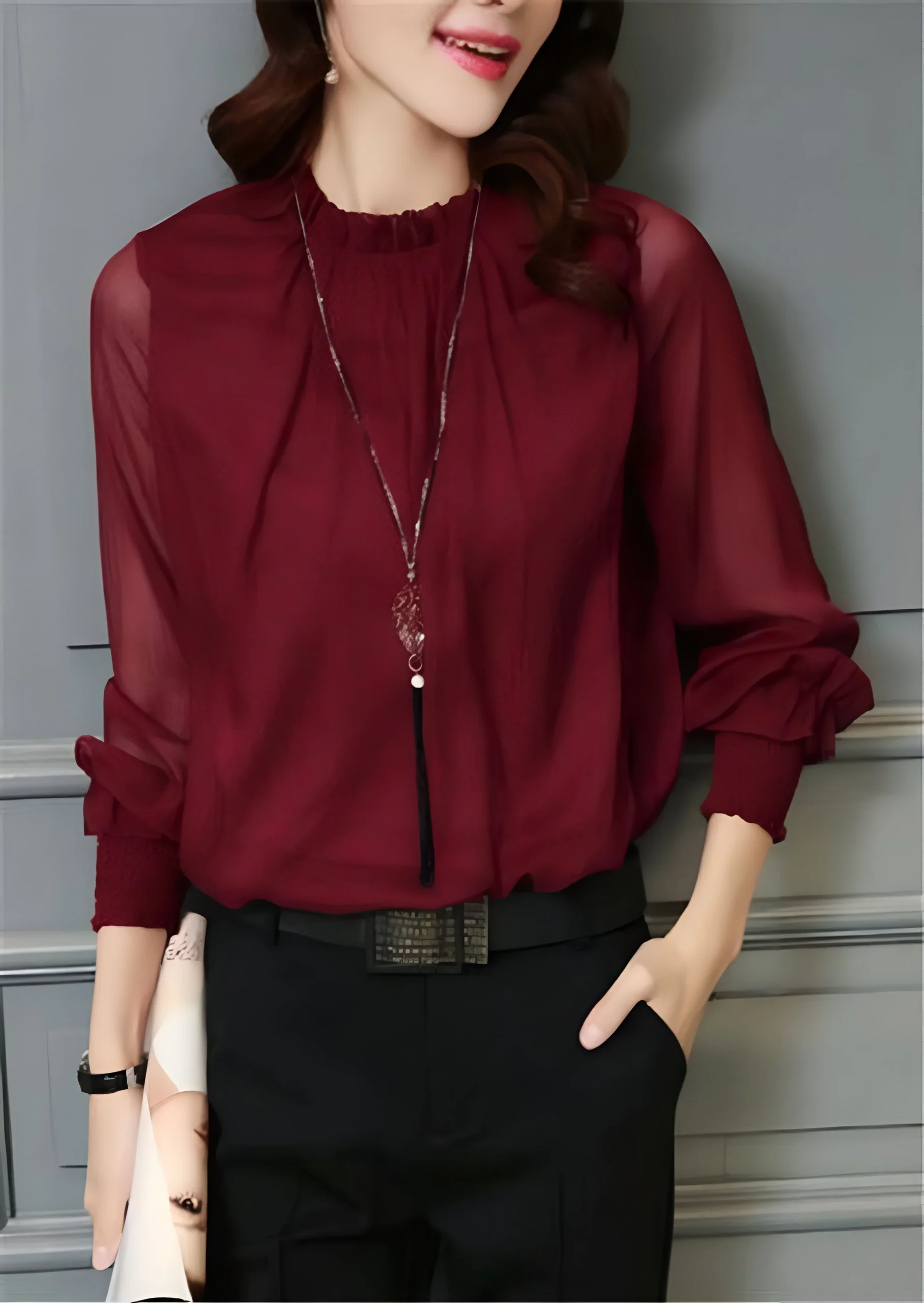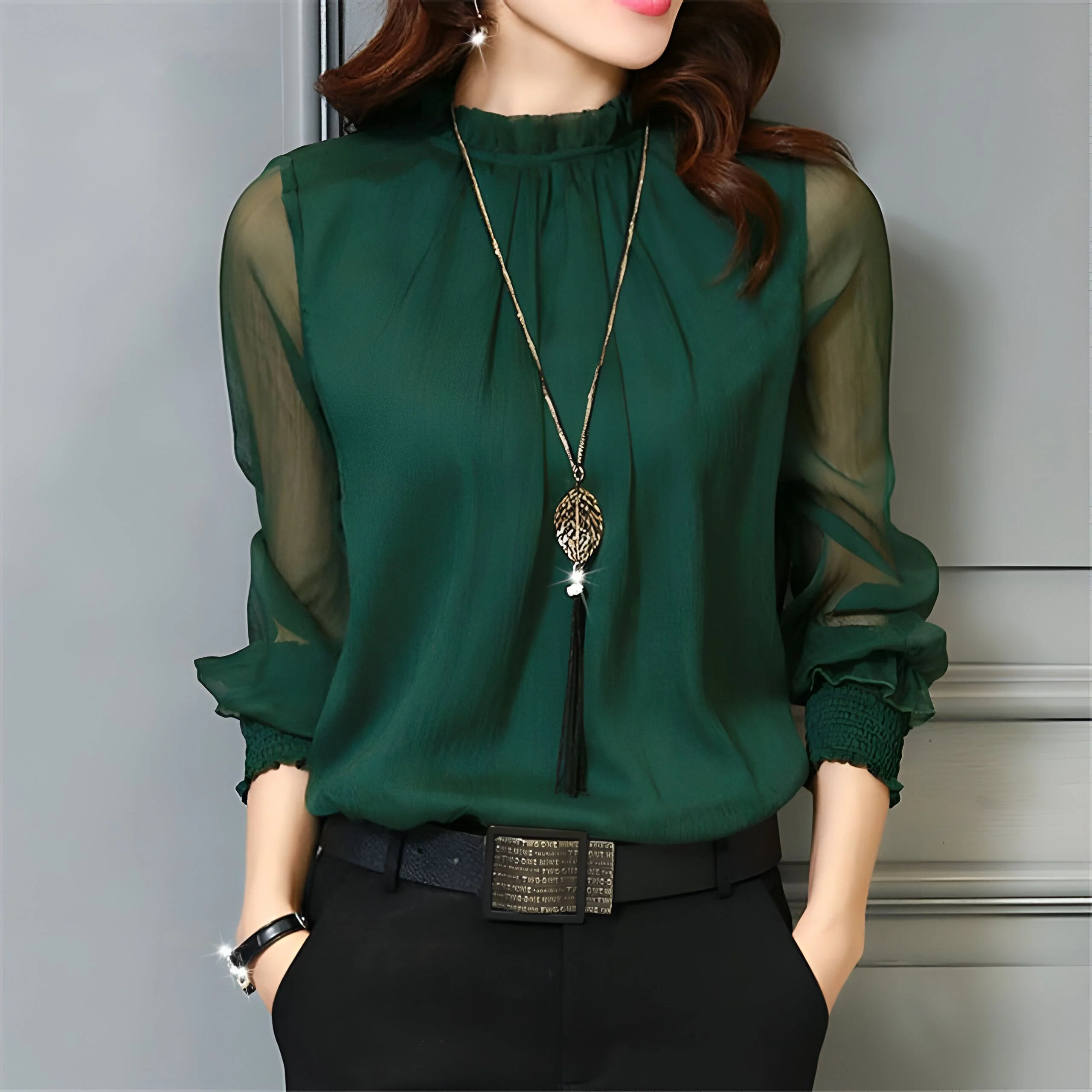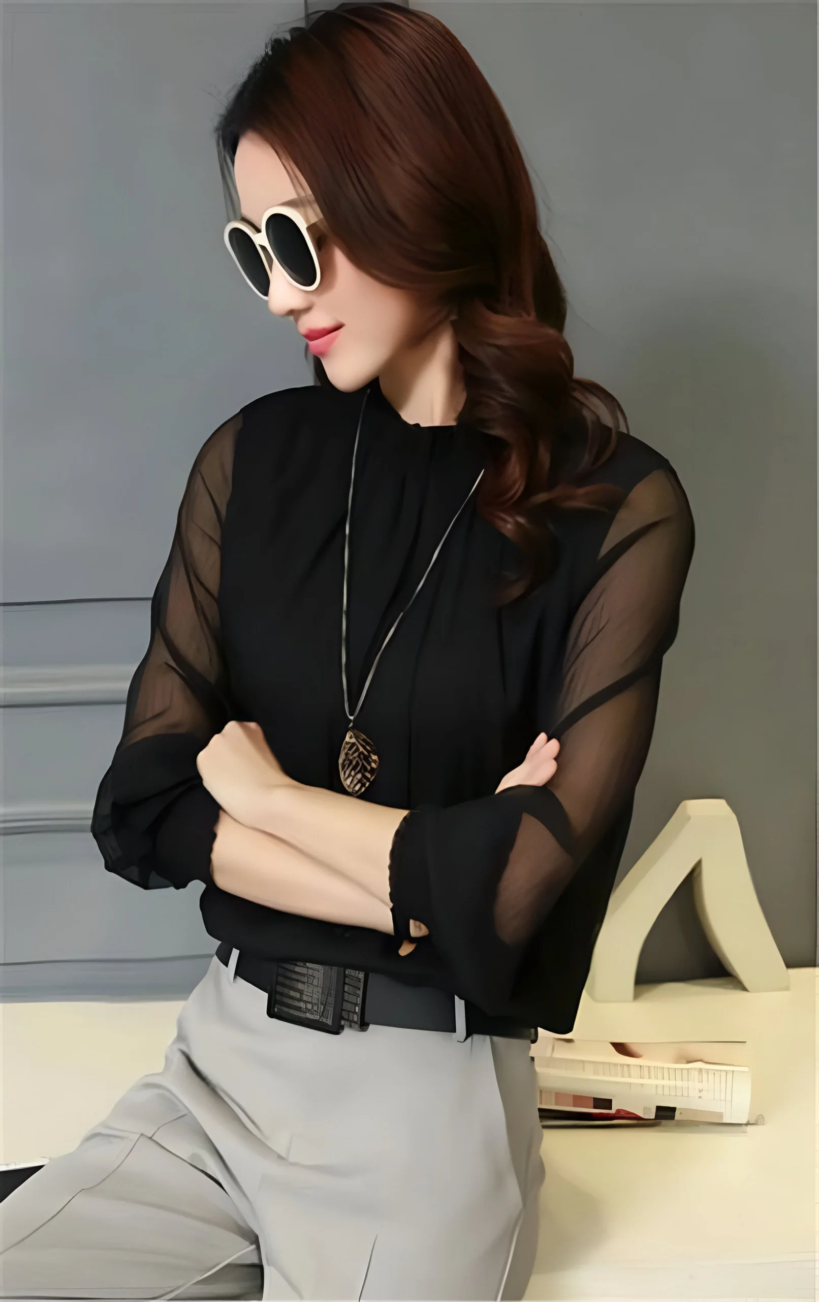 Les manches transparentes, légèrement bouffantes au niveau des poignets, apportent une touche de féminité et de mystère. L’équilibre entre transparence et opacité crée un effet visuel captivant, mettant en valeur votre personnalité sans jamais tomber dans l’excès. Vous vous sentirez à la fois élégante et à l’aise dans ce chemisier conçu pour sublimer votre féminité.