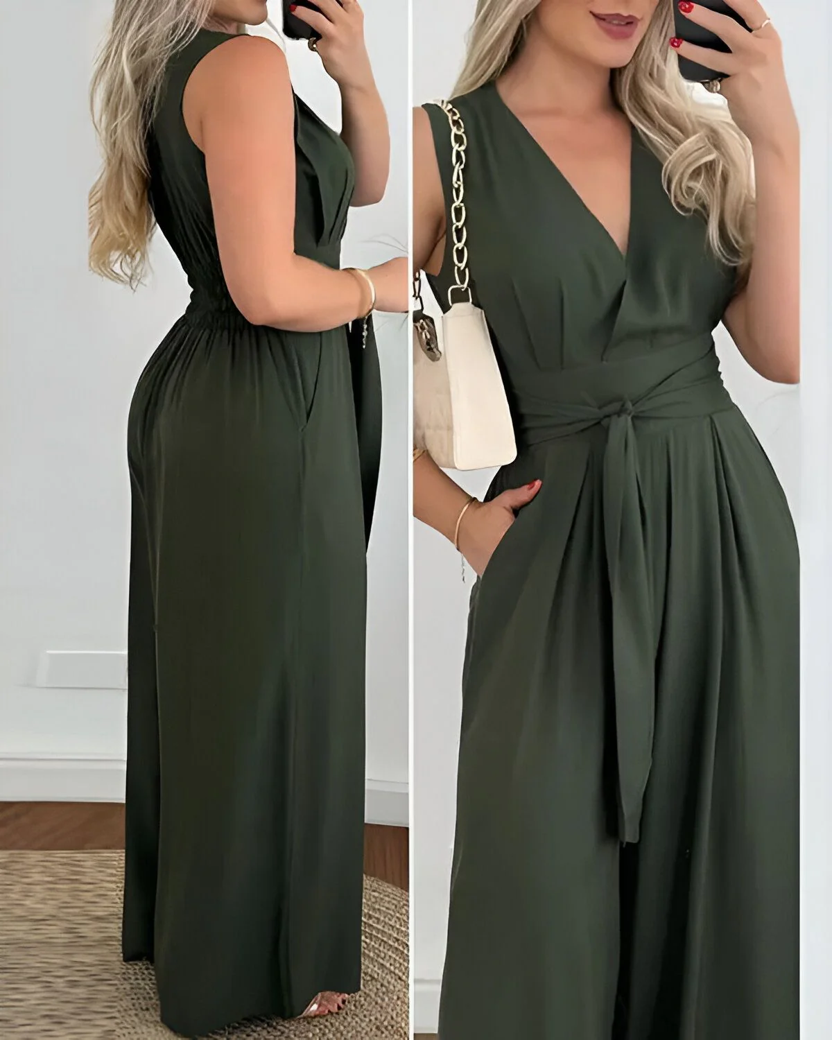 Incarnant l’élégance décontractée avec une touche de sophistication, cette combinaison à jambe large avec poche à détail noué deviendra rapidement un incontournable de votre garde-robe. Confectionnée en 100% polyester, elle offre un confort inégalé sans compromettre le style. Son col en V et sa coupe sans manches lui confèrent une allure moderne, tandis que sa longueur et son motif uni la rendent idéale pour toutes les occasions.