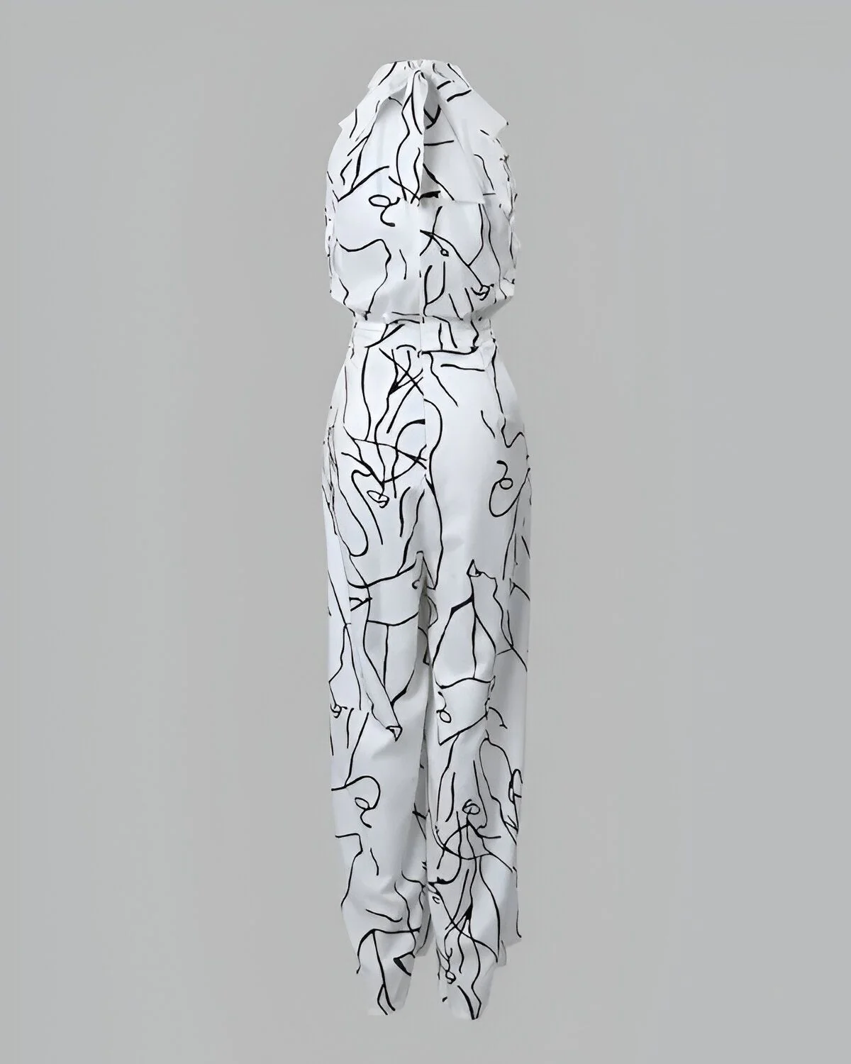 La combinaison jambe large à imprimé abstrait est non seulement élégante, mais également pratique. Son tissu léger offre une légère élasticité, vous permettant une liberté de mouvement optimale tout au long de la journée. Que vous soyez au travail, en promenade en ville ou en soirée, cette combinaison vous accompagnera avec style et confort.