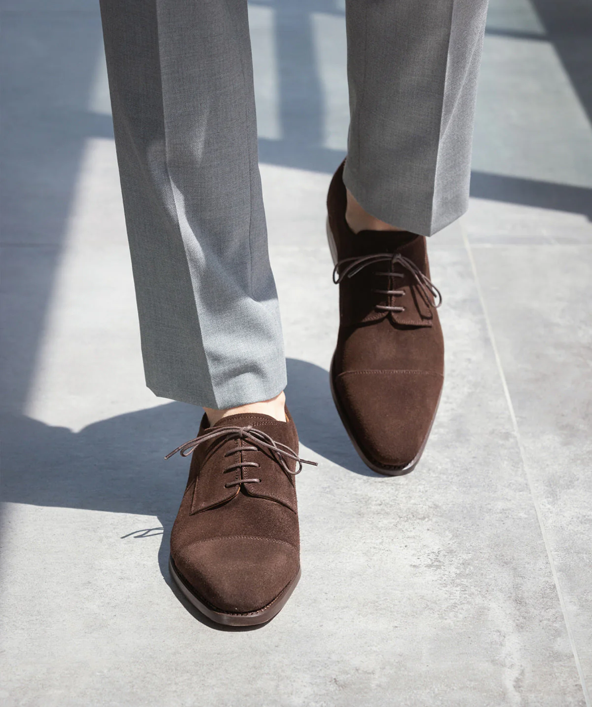 Finsbury est le leader de la chaussure haut de gamme pour hommes. Spécialiste du cousu GoodYear et du cousu Blake, Finsbury propose des souliers de ville, des boots, des mocassins, des sandales, des sneakers et une large gamme d’accessoires. La chaussure Derby ELVIS Daim Marron à lacets dont les quartiers sont cousus par-dessus l’empeigne. Ce modèle convient parfaitement aux morphologies à fort cou de pied et offre un chaussant des plus confortable. Existe également en cuir noir, bordeaux et noyer.