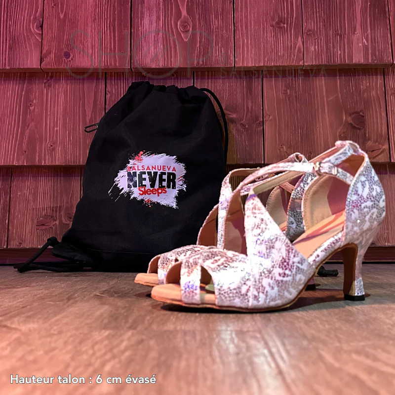 Les Chaussures de Danses Latines « Éclats Argentés » de SalsaNueva sont l’allié de choix pour les tours de piste éblouissants et les entraînements rigoureux. Laissez ces talons accentuer votre passion pour la salsa, la bachata et les rythmes latins, vous garantissant un confort et un style inégalés. Disponibles exclusivement chez SalsaNueva Shop, ces talons sont l’appel de la piste de danse à vos pieds. Dansez avec la lumière de la lune à vos pieds dès aujourd’hui !