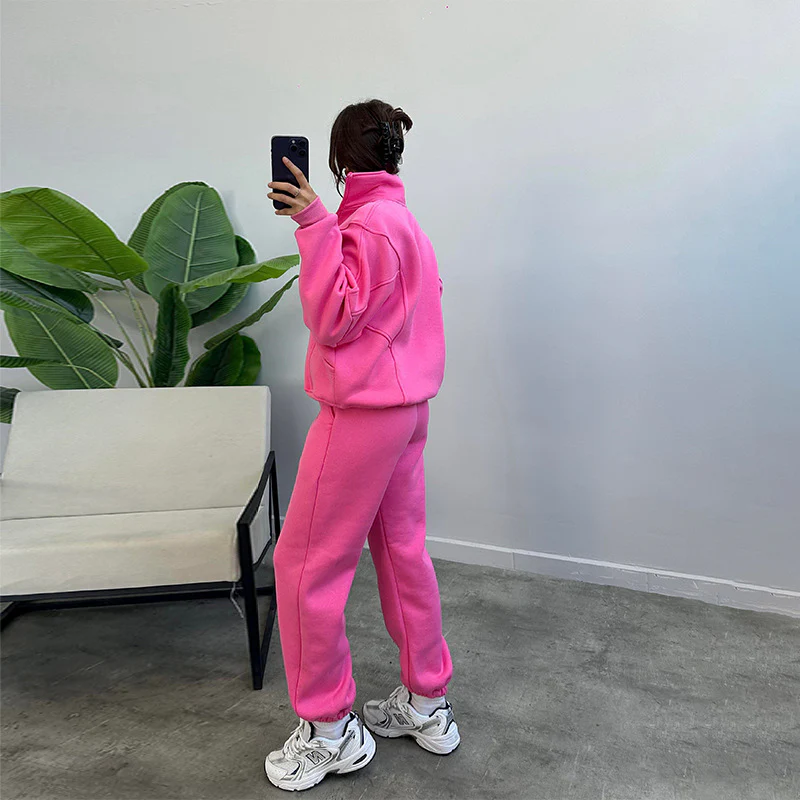 Adoptez un style à la fois sportif et chic avec Élodie, un ensemble jogging tendance qui combine élégance et confort. Son cardigan zippé à col montant et son pantalon à cordon offrent une liberté de mouvement optimale, parfait pour une allure moderne et dynamique au quotidien.