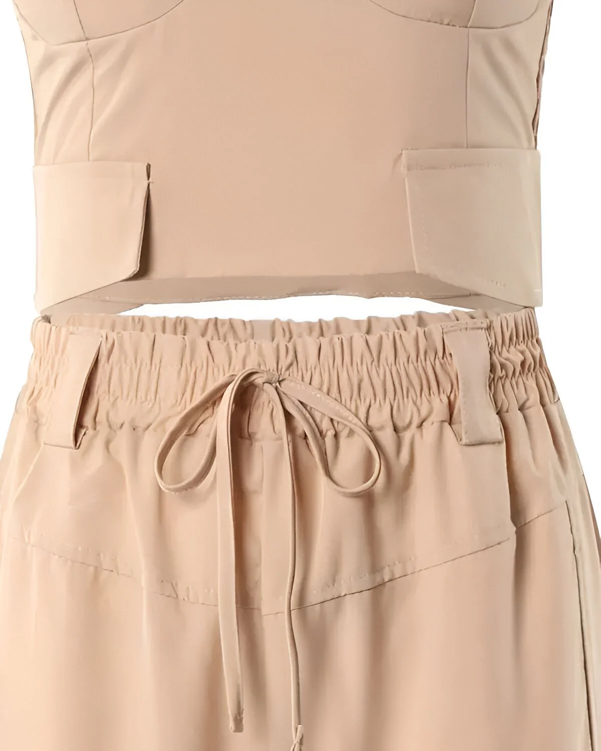 Le col en cœur et les bretelles spaghetti apportent une touche féminine et moderne à l’ensemble. La coupe longue et le pantalon à poche ajoutent quant à eux une fonctionnalité pratique. Pour une journée décontractée ou une sortie entre amis, cet ensemble s’impose comme un choix idéal alliant confort et élégance sans effort.